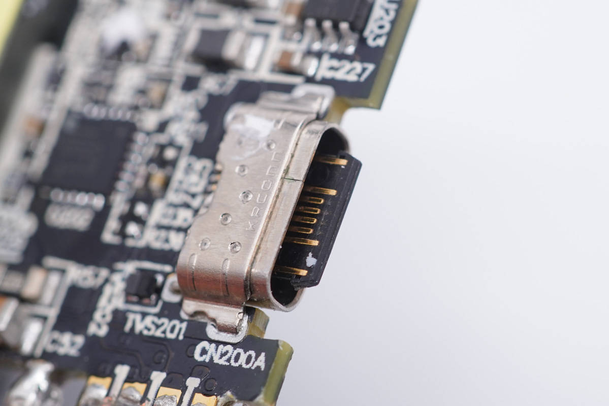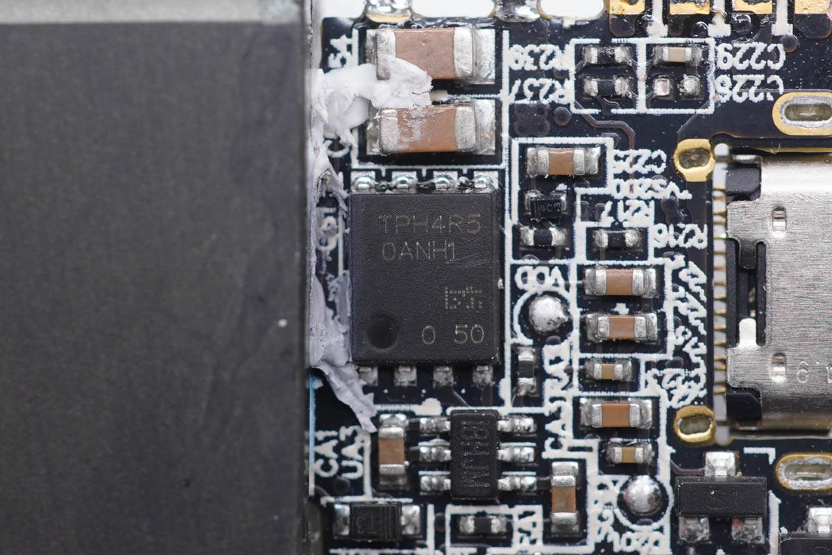 將平面變壓器小板拆下,輸出端可以看到同步整流控制器以及整流管,還有一顆VBUS開關(guān)管。USB-C母座沉板焊接。