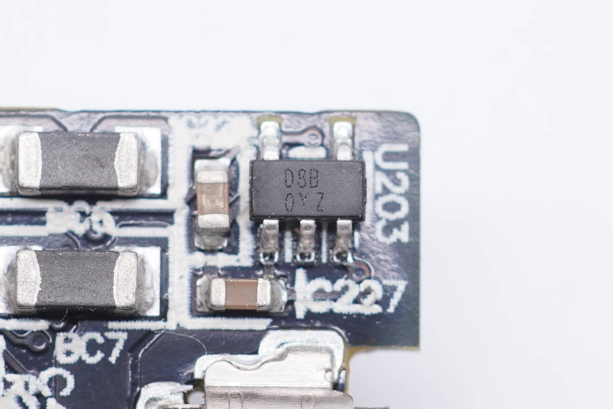 小板上一角是一顆絲印D8B的穩(wěn)壓芯片,為協(xié)議芯片供電。