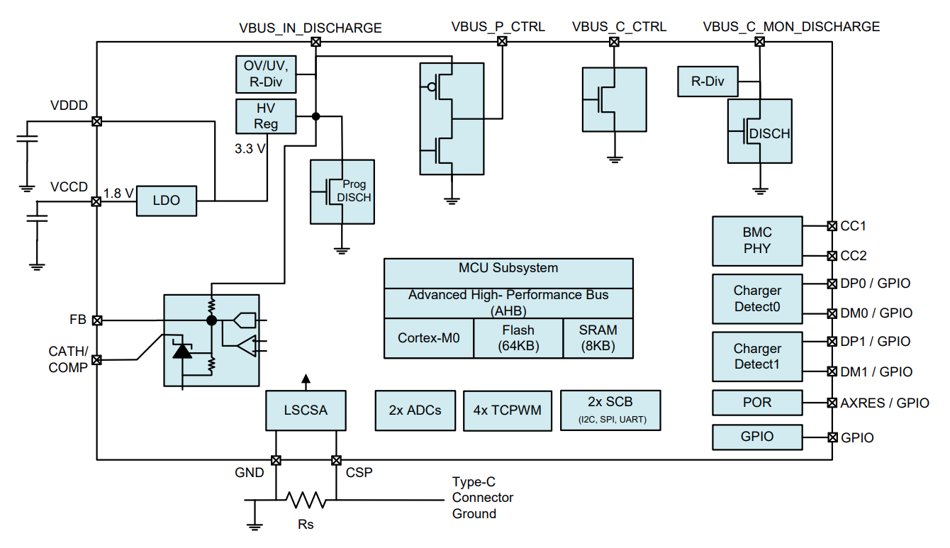 USB PD快充協(xié)議芯片采用賽普拉斯CYPD3174,該芯片支持PD3.0包括PPS協(xié)議,支持QC4.0,蘋果2.4A等其他快充協(xié)議;內(nèi)置多重全面的保護功能,內(nèi)置32位 M0處理器,集成振蕩器且無需外部時鐘。