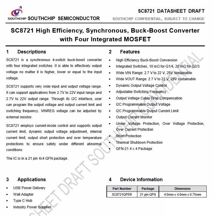 南芯SC8721詳細資料。充電頭網(wǎng)了解到,采用該芯片的產(chǎn)品還有ANKER 25600mAh移動電源、努比亞紅魔45W USB PD氘鋒移動電源、小米20000mAh移動電源、thinkplus 14000mAh 45W PD快充移動電源等。