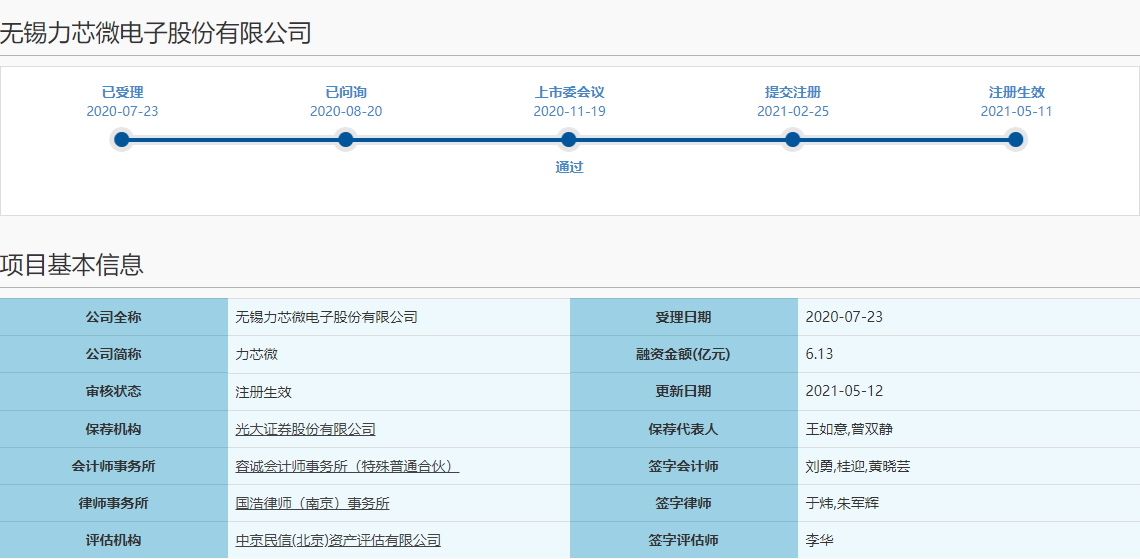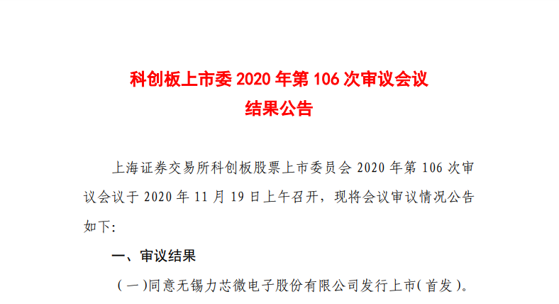 2020年11月19日,上海證券交易所同意無錫力芯微電子股份有限公司首次公開發(fā)行上市。