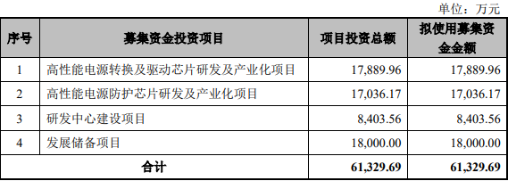 根據(jù)招股書,本次力芯微擬公開發(fā)行人民幣普通股16000000股,占公司發(fā)行后總股本的比例25%。力芯微本次科創(chuàng)板IPO募資資金凈額將用于四個(gè)方向,分別是高性能電源轉(zhuǎn)換及驅(qū)動(dòng)芯片研發(fā)及產(chǎn)業(yè)化項(xiàng)目、高性能電源防護(hù)芯片研發(fā)及產(chǎn)業(yè)化項(xiàng)目、研發(fā)中心建設(shè)項(xiàng)目、發(fā)展及科技儲(chǔ)備基金。