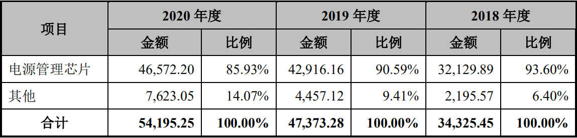 其中主營(yíng)業(yè)務(wù)電源管理芯片收入占比逐年減少,2018年度收入約為3.2億元,占總營(yíng)收比例為93.6%;2019年,電源管理芯片收入約為4.29億元,占比降至90.59%;到了2020年,電源管理芯片收入約為4.66億元,占比降至85.93%。
