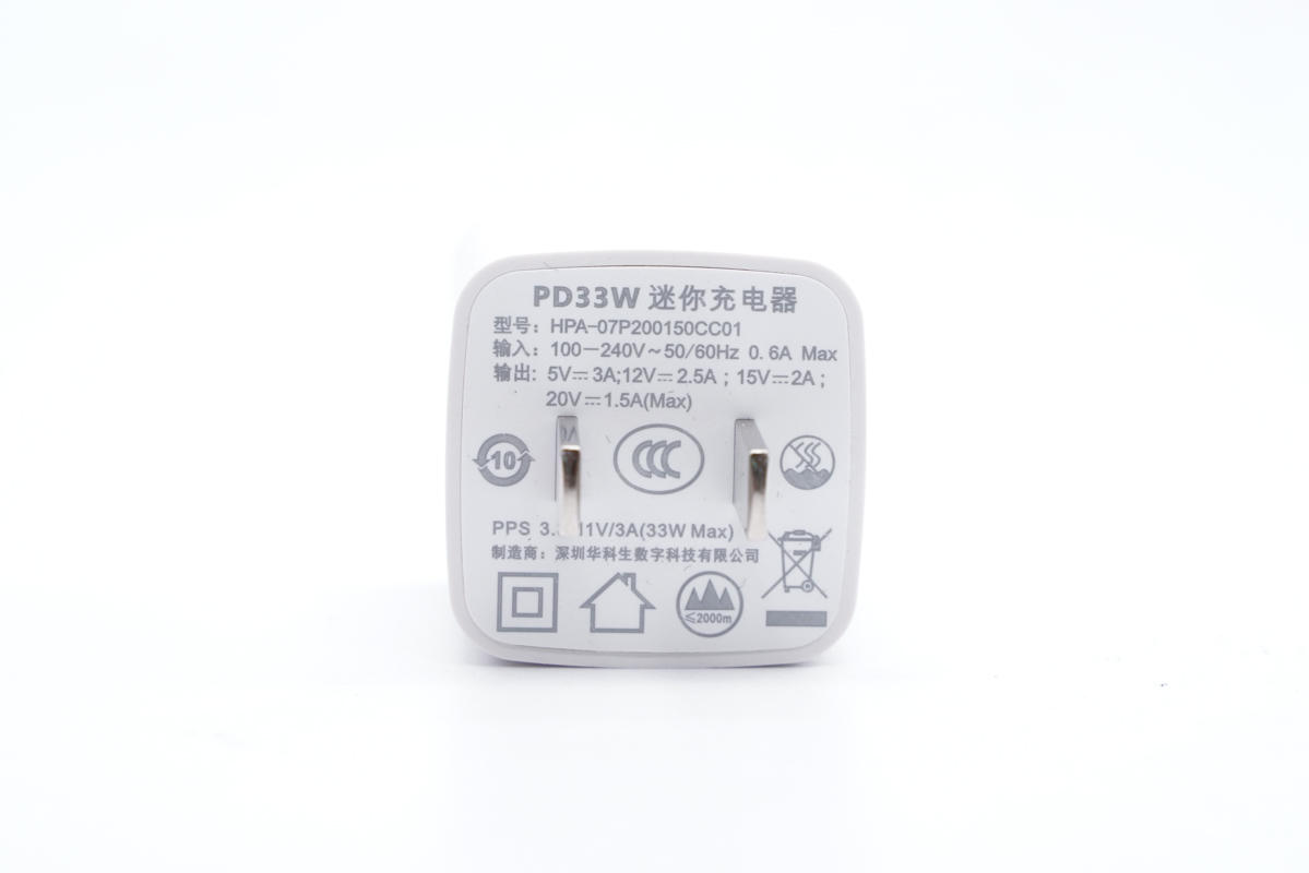 面對正在快速興起的33W迷你快充市場,深圳華科生數字科技有限公司近期推出了一款迷你33W快充供客戶選擇。這款產品沒有氮化鎵加持,卻能將功率密度做到1.05W/cm3,可以說相當厲害了。另外充電器兼容快充協議豐富,電壓檔位齊全,還支持PPS快充,可以滿足市面上大多數手機、平板快充需求。下面充電頭網就對其進行詳細拆解,看看充電器是怎么做得如此小巧的。