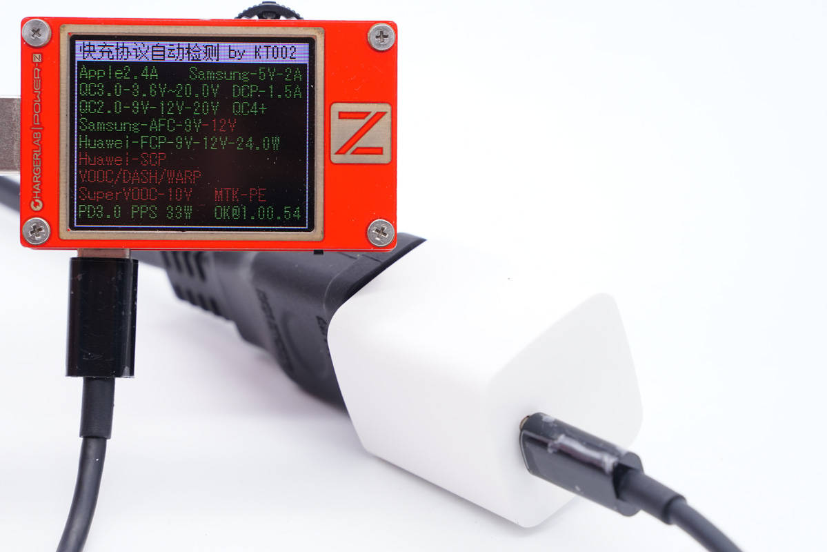 使用ChargerLAB POWER-Z KT002測得USB-C口支持Apple 2.4A、Samsung 5V2A、DCP協議,以及QC2.0/3.0、AFC、FCP、PD3.0和PPS快充協議。