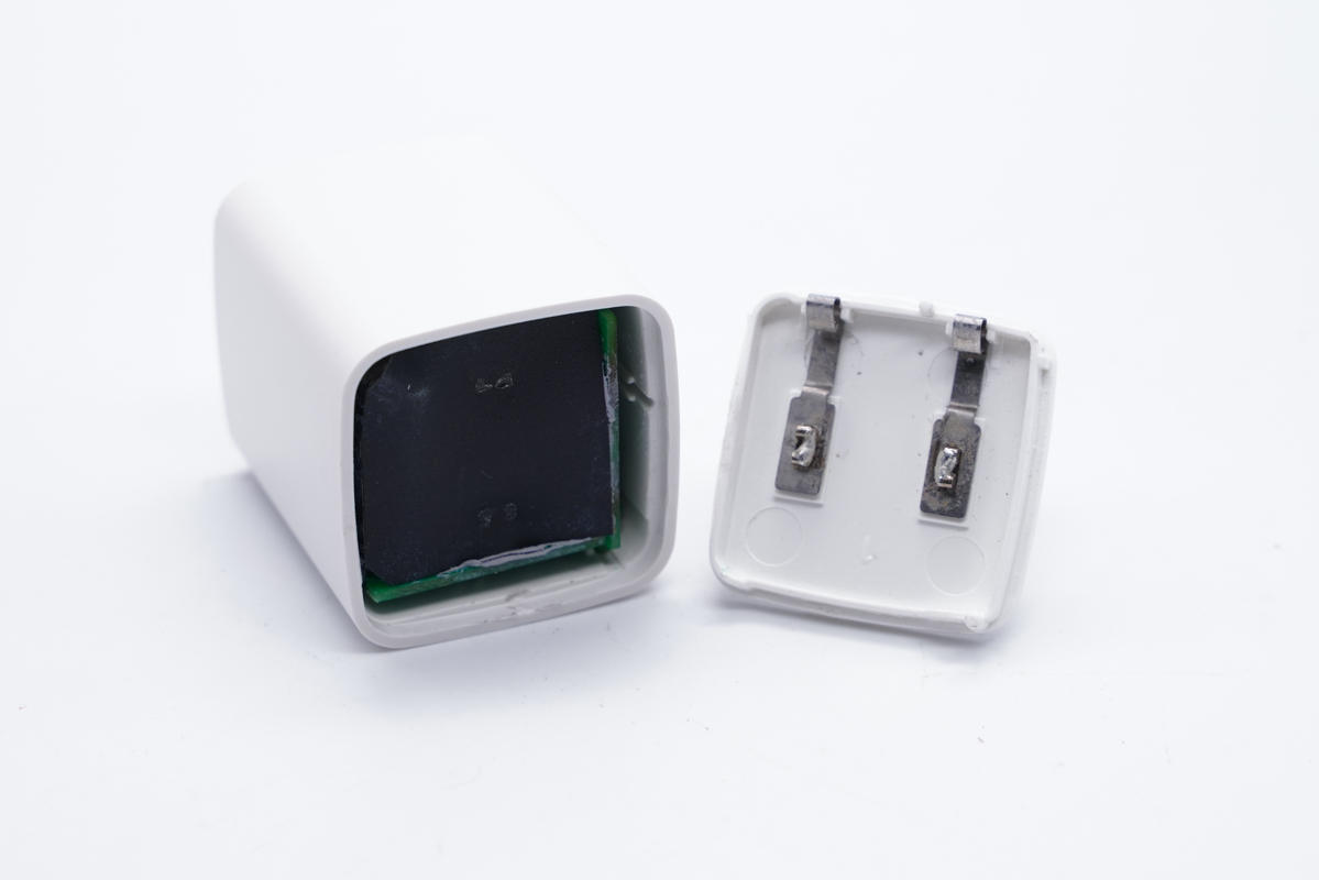 拆開外殼,輸入端設有絕緣隔離板,插腳和金屬彈片壓接,接觸通電設計。