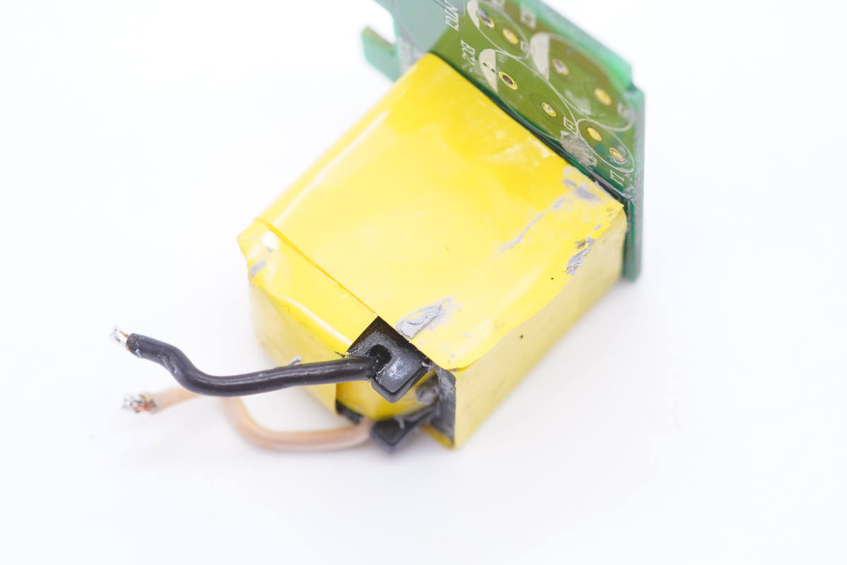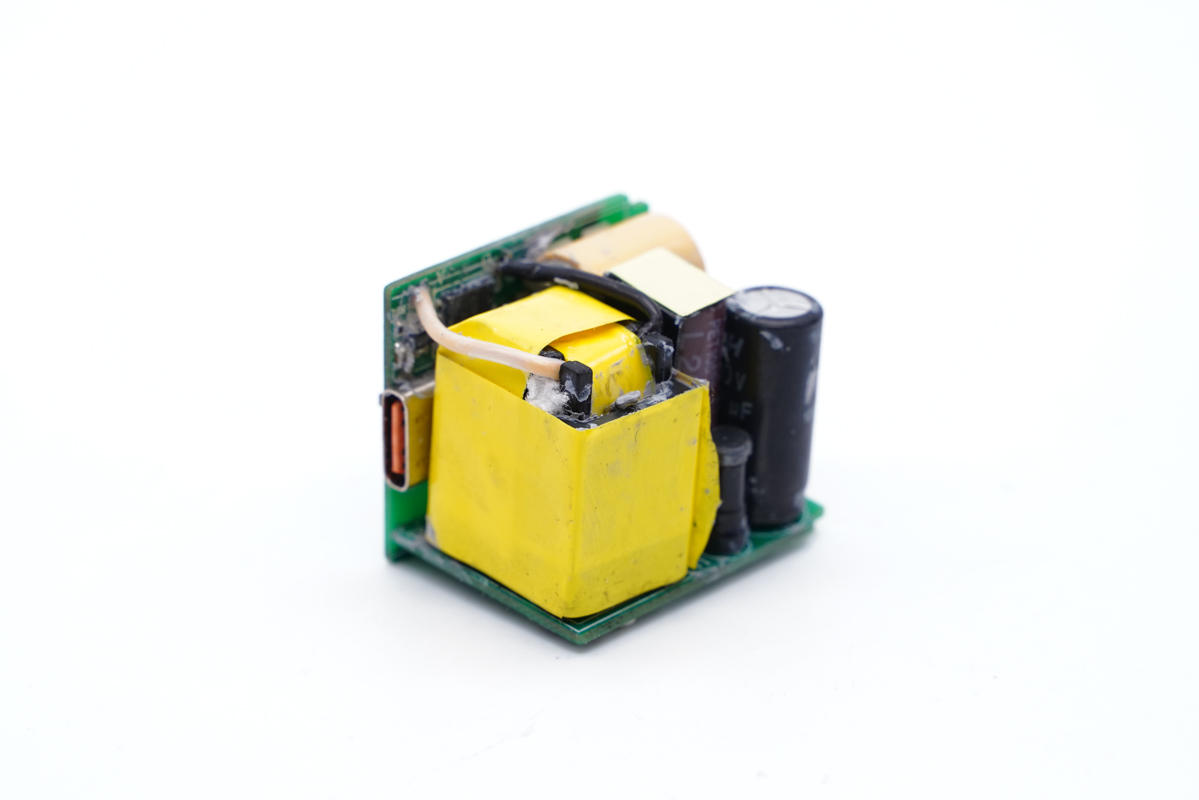 變壓器特寫,通體纏繞膠帶絕緣。充電頭網了解到,該變壓器為深圳金尚電子科技有限公司生產,型號:JS-3033。深圳市金尚電子科技有限公司專門為小體積高密度電源產品量身定制變壓器,目前很多公司小體積產品都用他們家變壓器。