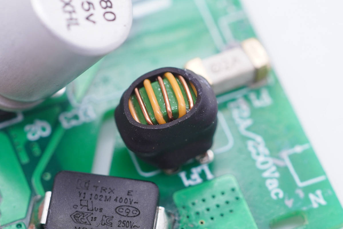 輸入端一覽,電容和變壓器間有絕緣板隔離,固態電容外套膠套絕緣。