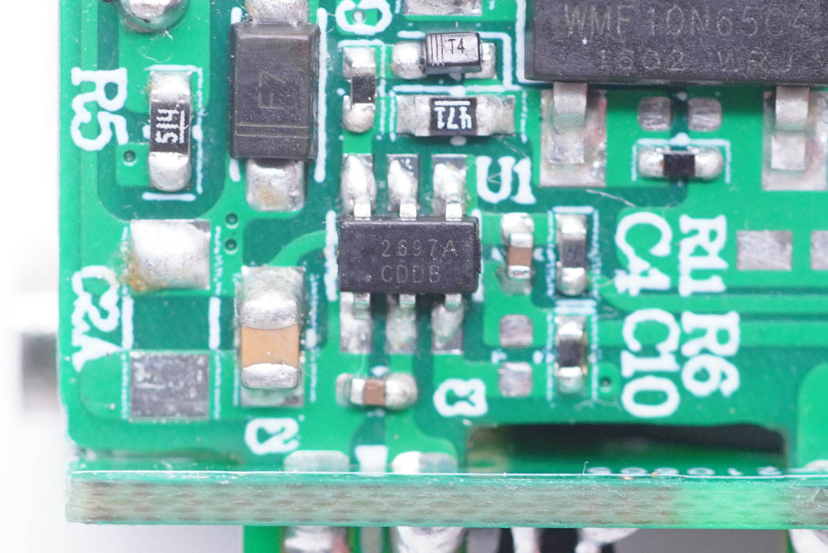 開關電源主控芯片采用茂睿芯MK2697,這是專為PD/快充應用優化的QR PWM控制器。該控制器寬VCC工作電壓范圍(9V-90V) 可以使其覆蓋PD/PPS從3.3V-23V的輸出范 圍而不需要使用額外的輔助繞組或者線性降壓電路。