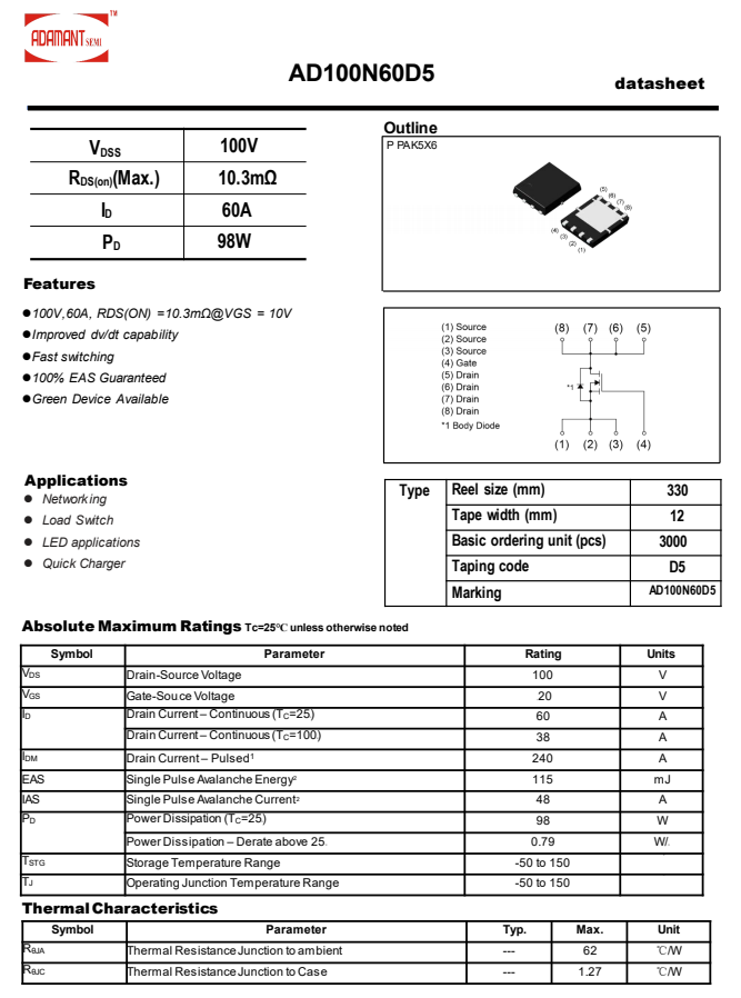 艾德曼AD100N60D5資料信息。