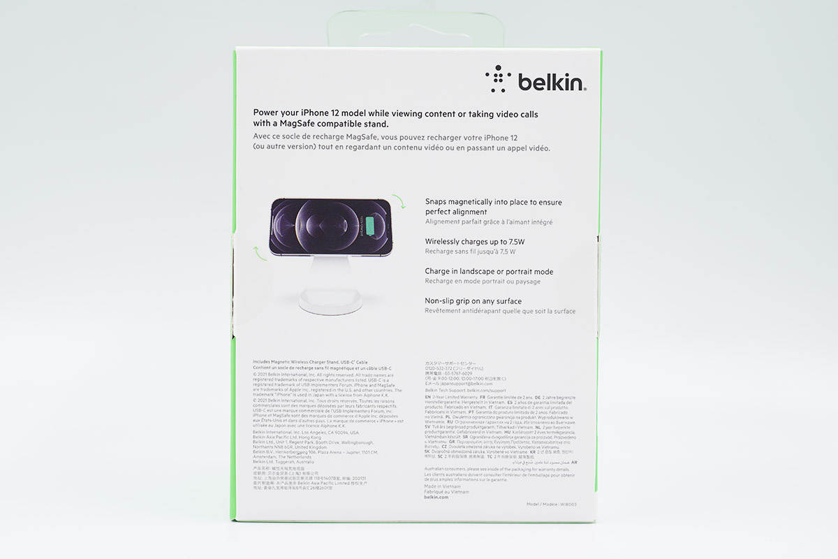 包裝盒白綠配色,整體設計信息豐富。正面印有belkin品牌、無線充使用場景圖、特性等,側面印有產品適配機型列表。
