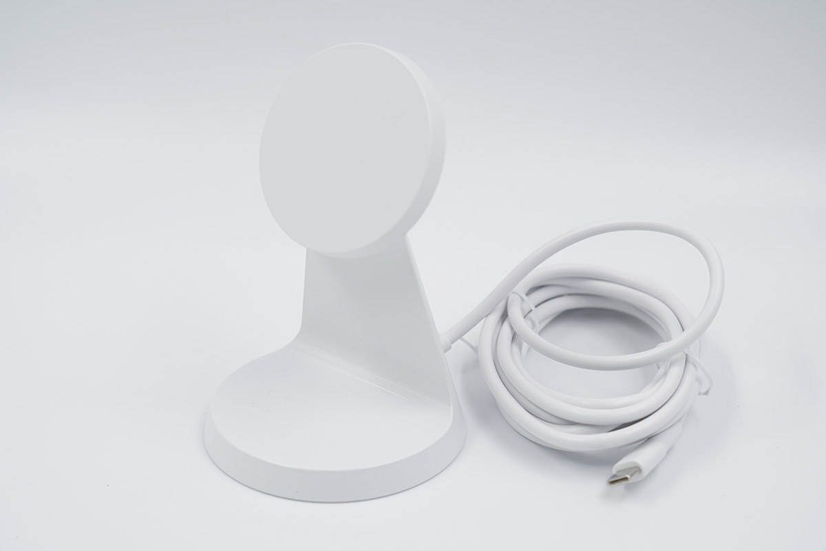 產品采用PC材質塑料外殼,表面分別磨砂和亮面處理,整體風格十分簡約。無線充自帶USB-C輸入線纜,市面上大多數PD快充充電器都能很好適配進行供電。