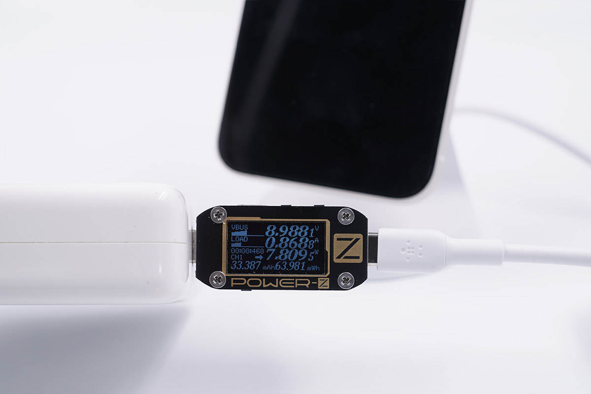 使用ChargerLAB Power-Z KM001C測得此時無線充輸入功率為9V 0.87A 7.8W。