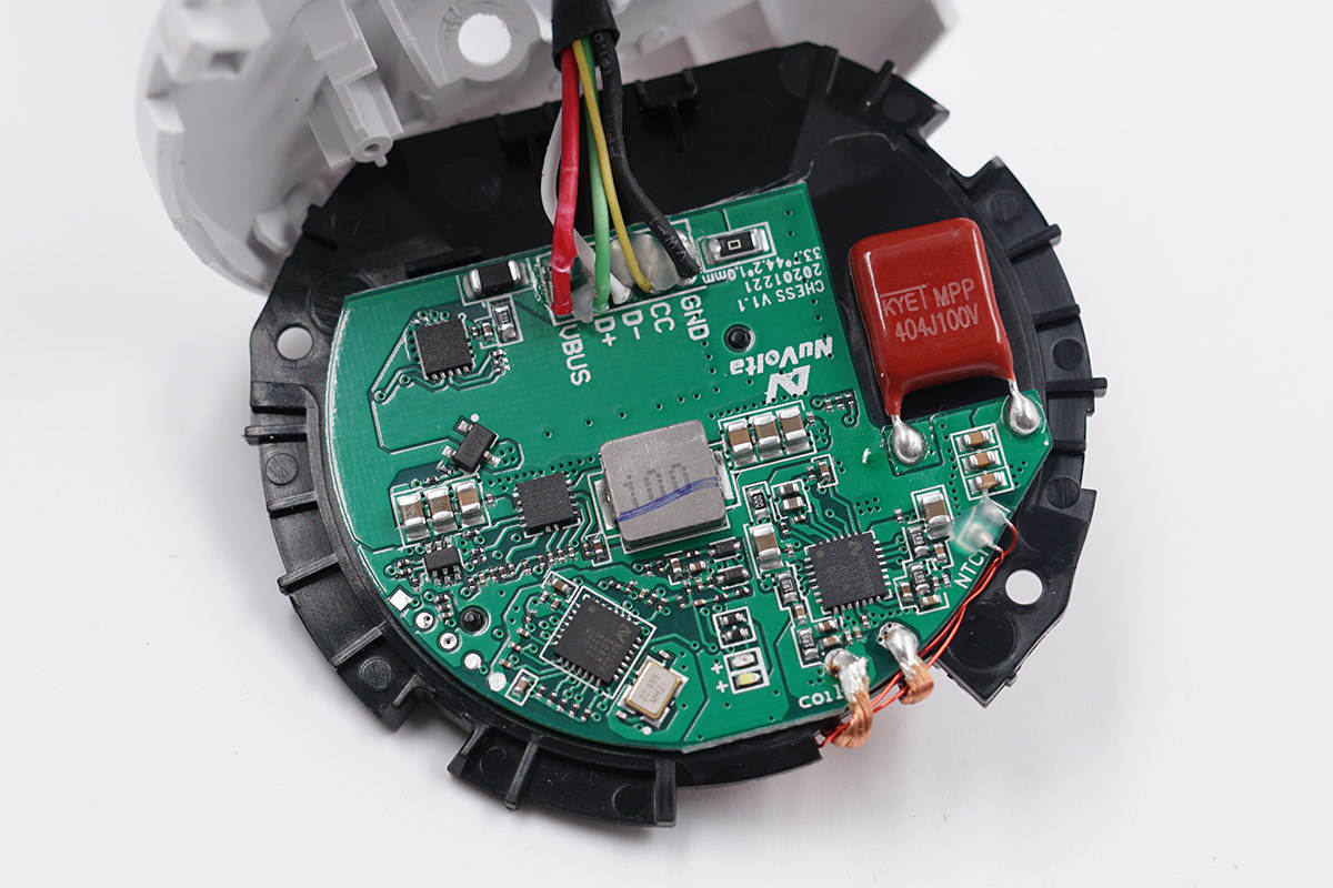 充電頭網拆解發現,無線充不僅是外觀簡約,內部結構也十分簡單。機身底部固定有配重鐵,頂部充電板內集成了所有的功能模塊。產品輸入端選用慧能泰HUSB238協議芯片取電,內置MPS MP2229降壓轉換器用于降壓,滿足定頻調壓的需求。貝爾金這款無線充電器采用了伏達半導體一站式定制方案,無線充架構由伏達NU1509+NU1009A實現。