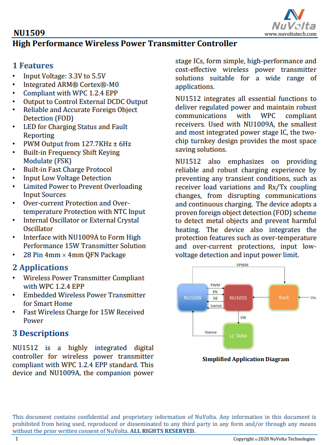 無線充電發射端控制芯片采用伏達半導體NU1509,集成了ARM-M0內核,涵蓋了高精度的FOD算法,符合WPC 1.2.4?EPP協議,控制高精度的PWM輸出,支持LED充電狀態指示,內置快充協議,并且支持完善全面的保護功能,滿足各種客戶的定制化需求。