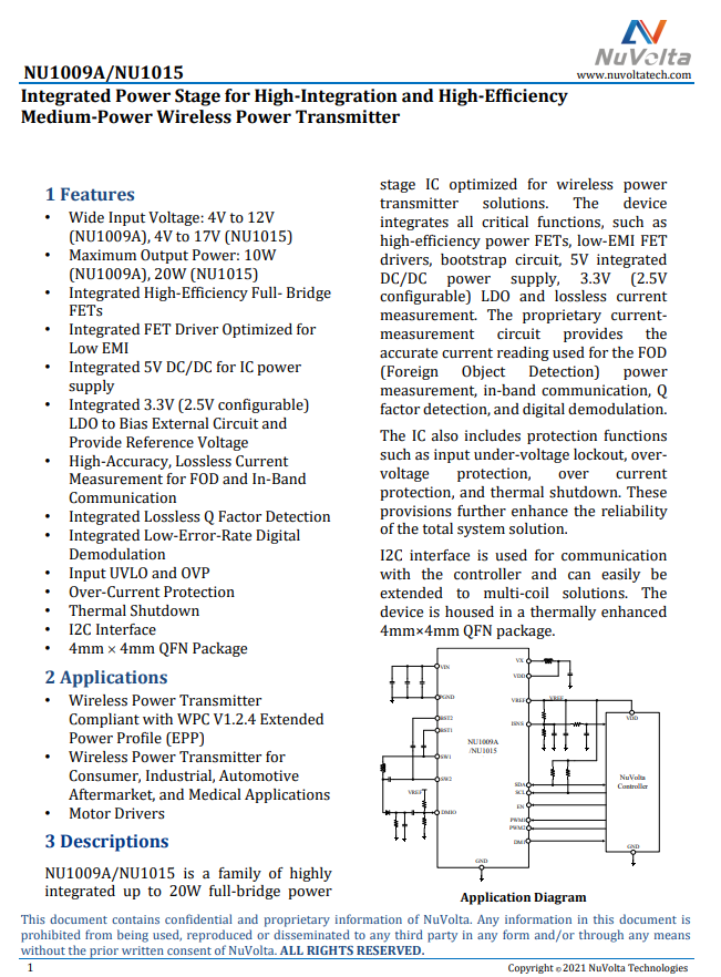 伏達半導體NU1009A,集成功率級全橋MOS管,用于無線充電發射,內置開關穩壓及LDO為主控IC供電,且內置高精度電流檢測和解調以及I2C通信,集成完善的保護功能。