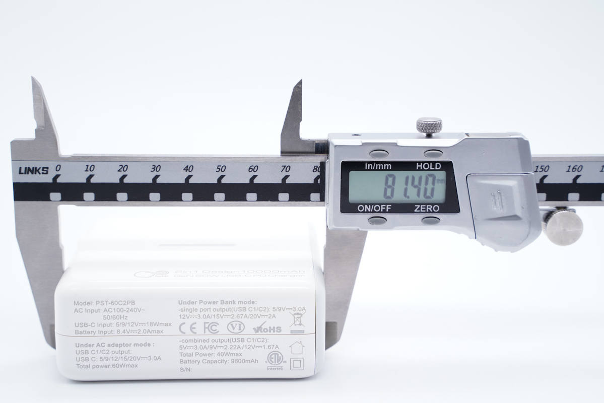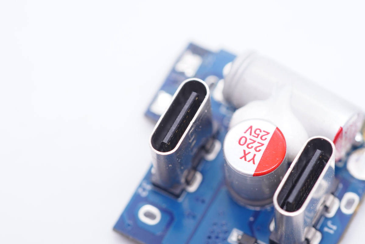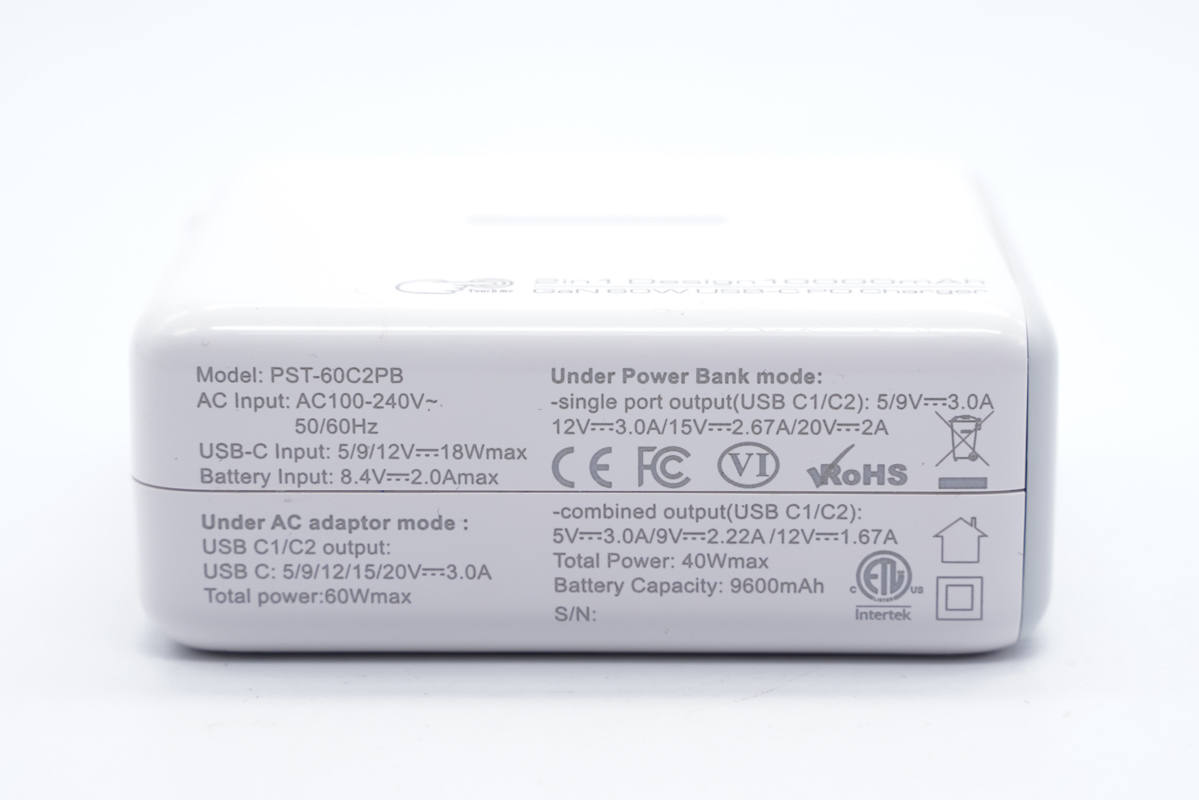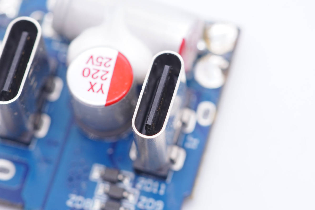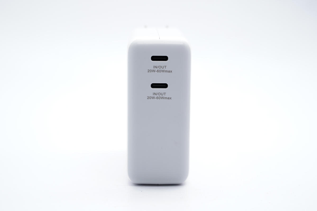 輸出端配有兩個一樣的USB-C接口,都支持雙向快充,功率20-60W。兩口支持盲插60W(充電器模式) 或盲插40W(移動電源模式)。