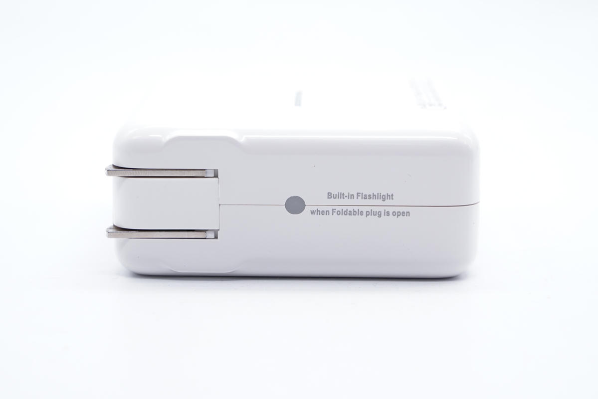 插腳兩側加入雙翼設計,日常使用更加穩定。中心處設有應急照明燈, 當插腳收起時, 應急照明燈會熄滅。當插腳打開時, 應急照明燈會自動亮起, 以便用戶在夜間找到墻上插座,或應急照明使用。
