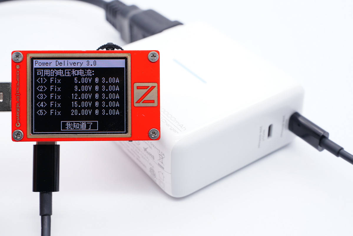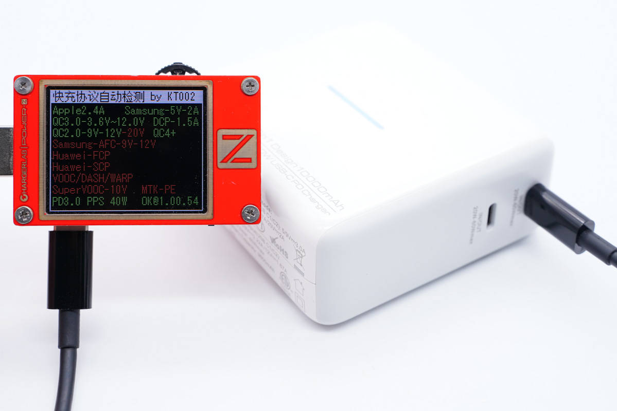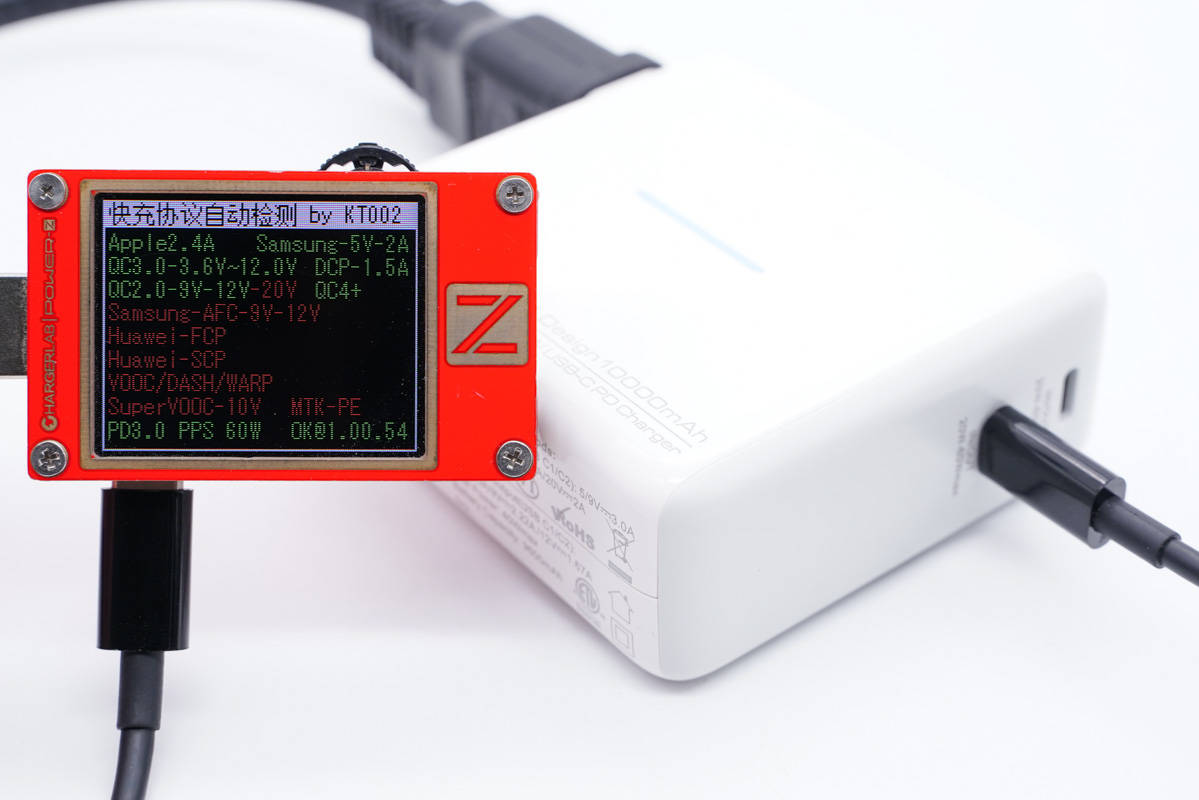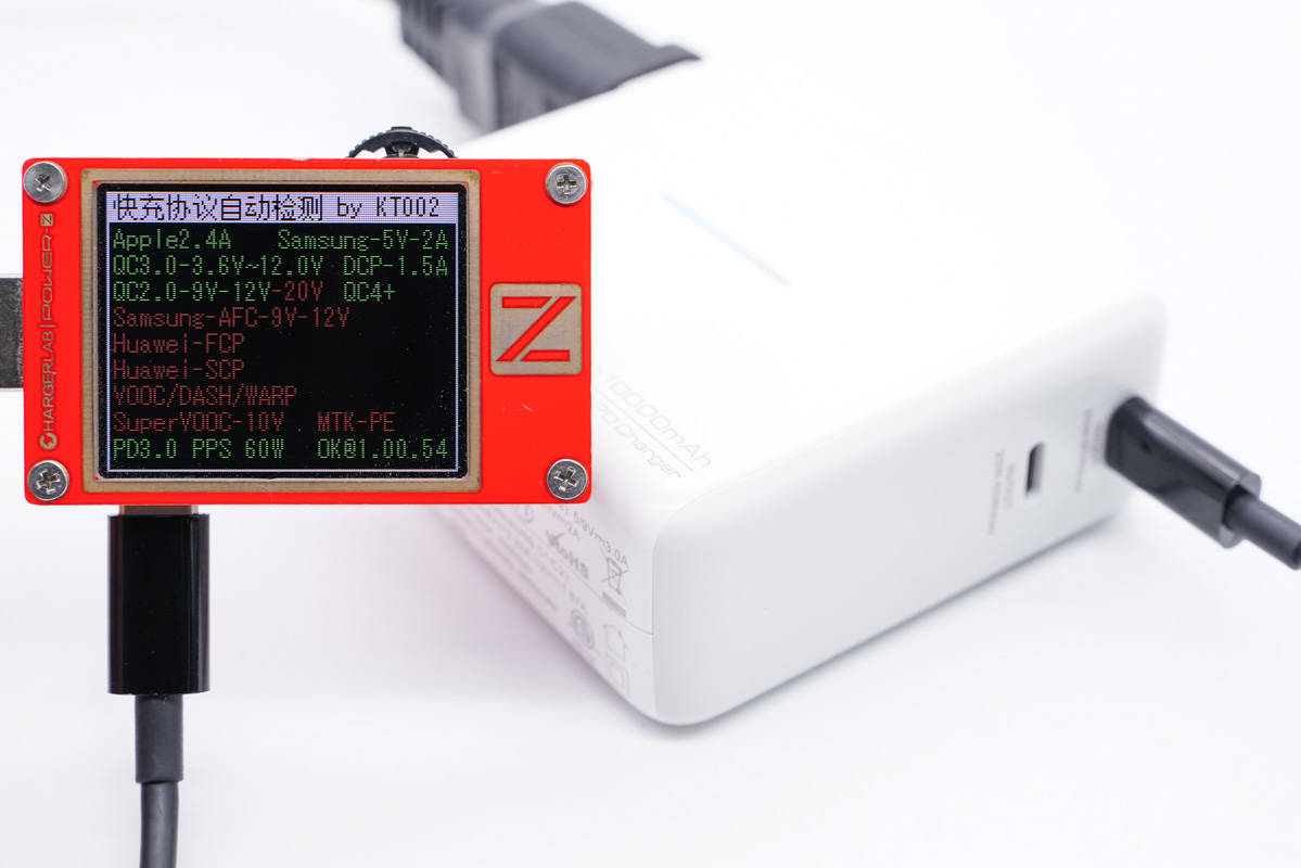 充電器模式下,使用ChargerLAB Power-Z KT002測得USB-C口支持Apple2.4A、Samsung 5V2A和DCP協議,以及QC2.0/3.0、PD3.0、PPS快充協議,最大功率能達到60W。