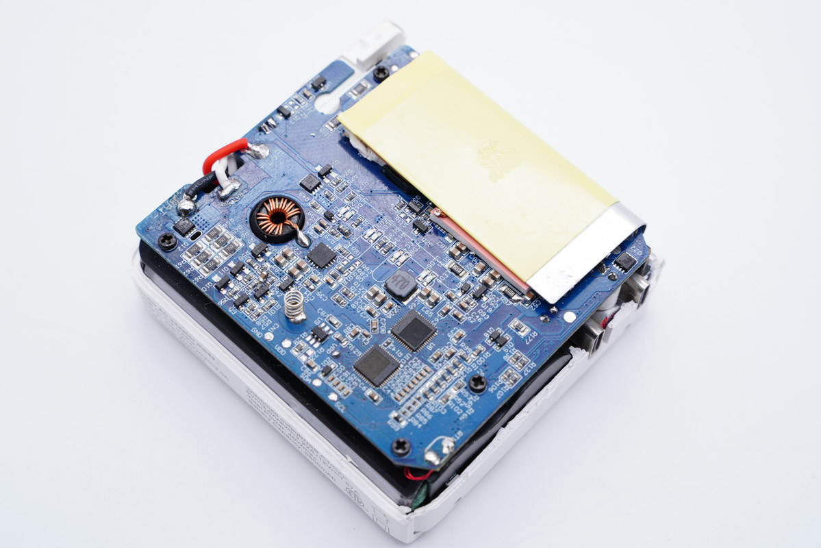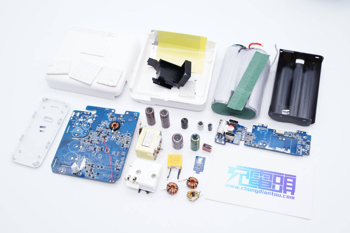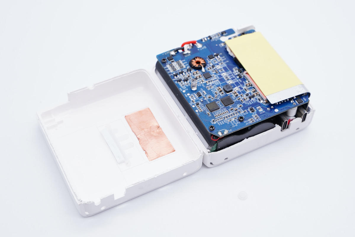 兩顆主控芯片同時也是移動電源主控芯片,不過信息不詳。另外采用永銘和云星小體積電容進行輸入輸出濾波,幫助壓縮體積。另外充電器內部設有熱敏電阻進行溫度監控,主要發熱器件也都配有散熱片和導熱墊幫助散熱,整體用料做工都比較講究。
