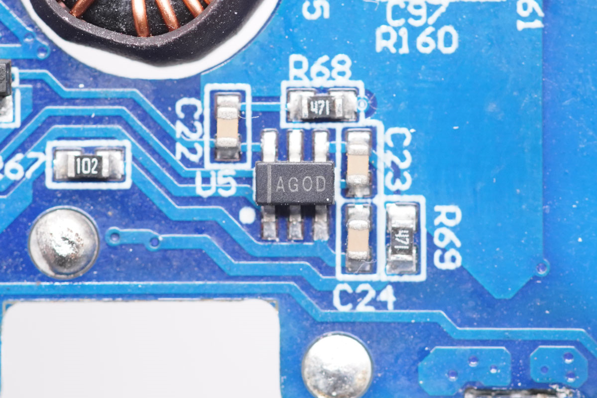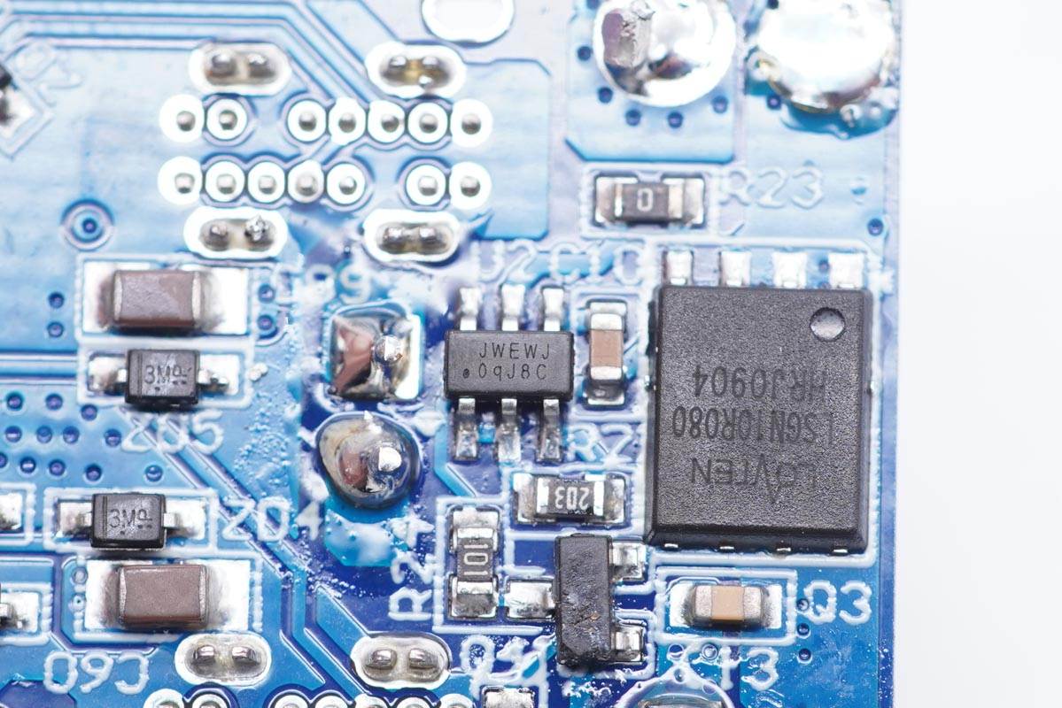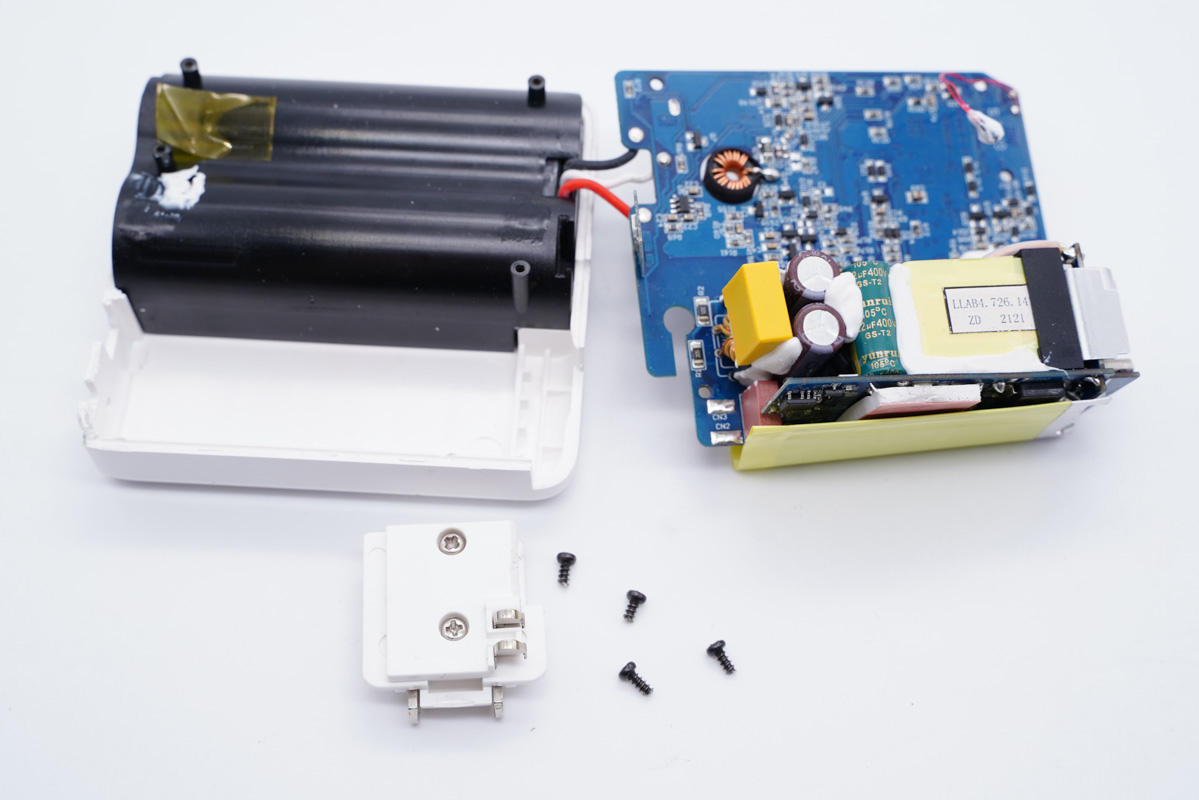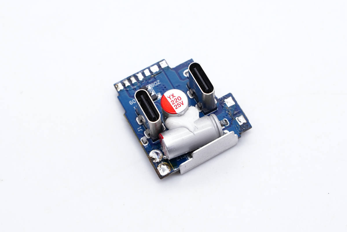兩顆主控芯片同時也是移動電源主控芯片,不過信息不詳。另外采用永銘和云星小體積電容進行輸入輸出濾波,幫助壓縮體積。另外充電器內部設有熱敏電阻進行溫度監控,主要發熱器件也都配有散熱片和導熱墊幫助散熱,整體用料做工都比較講究。