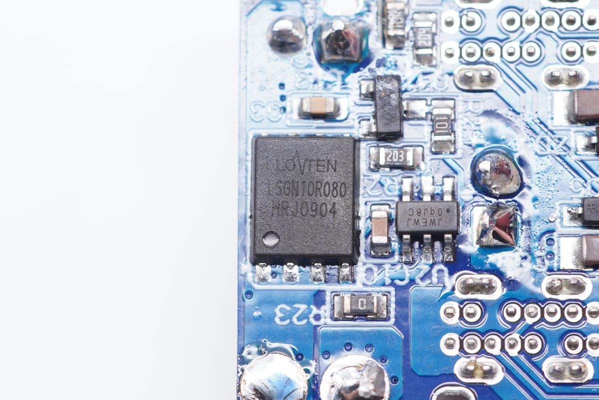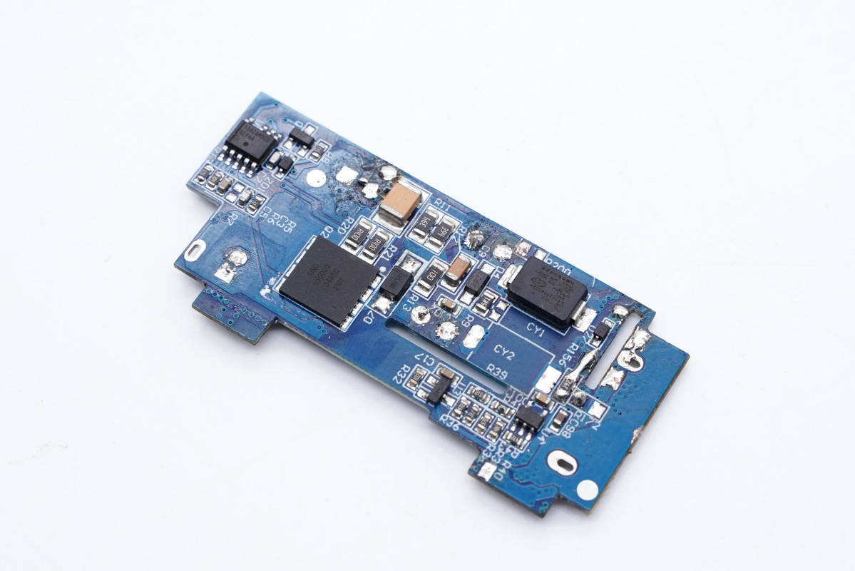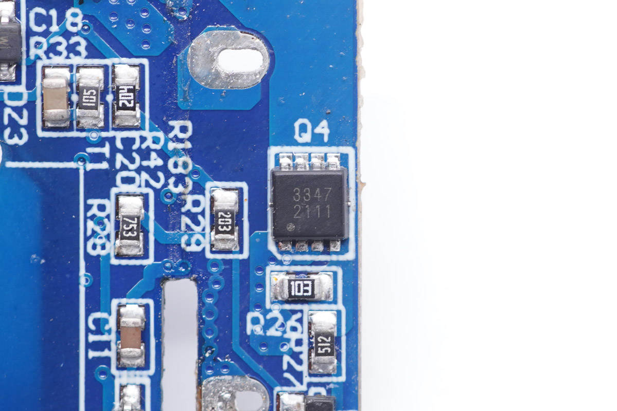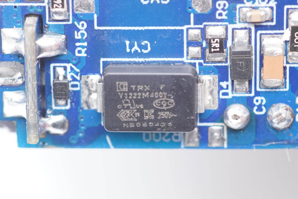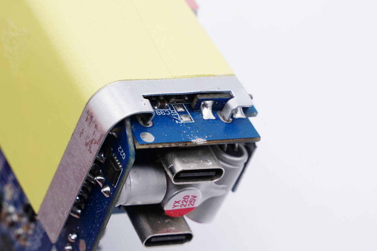 側邊小板背面設有主控芯片、氮化鎵功率芯片以及貼片Y電容等。