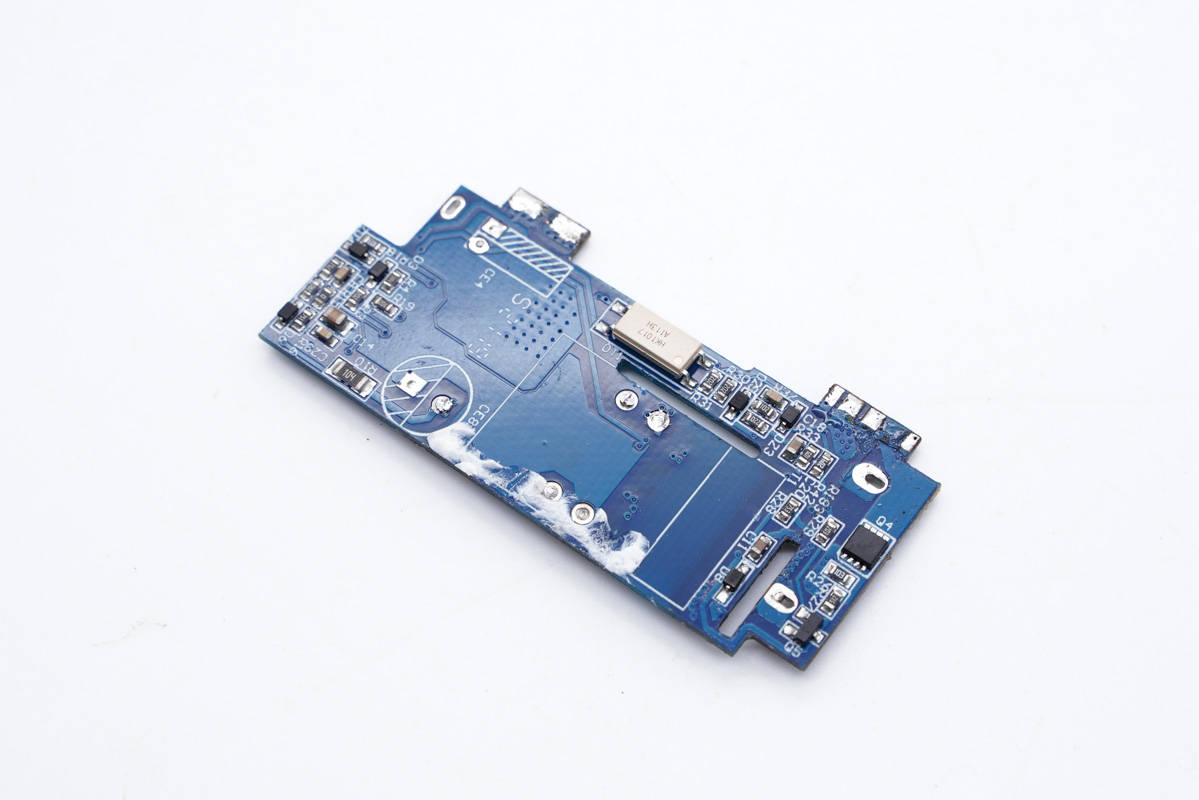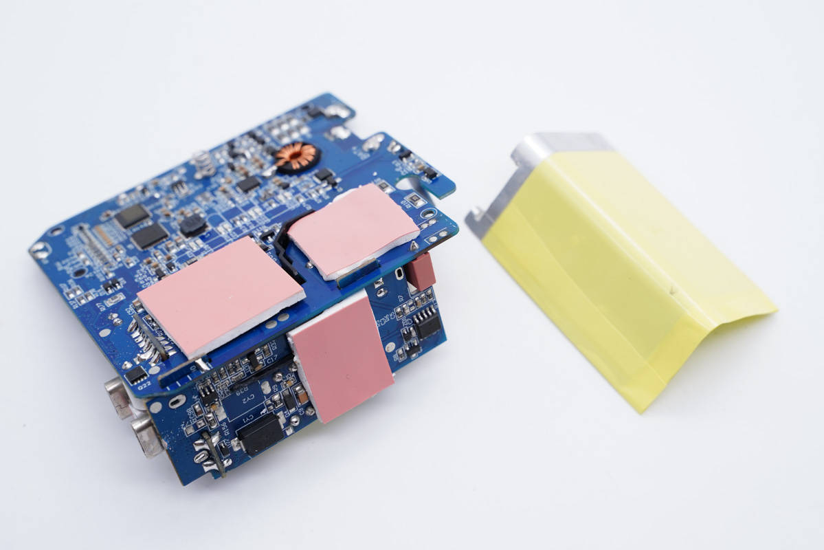 主板一側布局充電器,并配有散熱片幫助散熱,散熱片包裹絕緣膠帶。