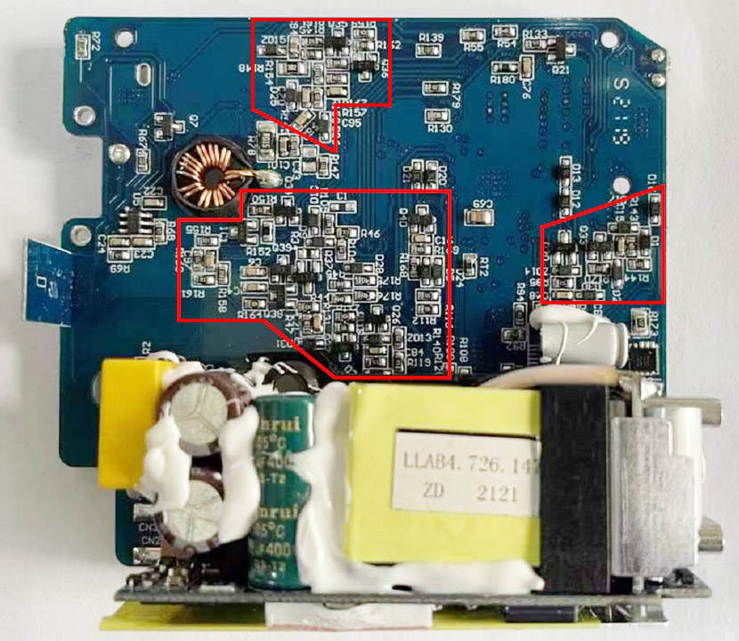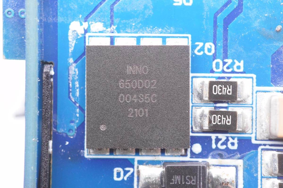 充電頭網通過拆解發現,這款產品獨到之處在于其搭建的特殊模擬電路以實現任意Bypass,?獨立參考源的DC/DC并聯供電,在市面上完全沒有先例。同時充電器部分采用了安森美主控搭配杰華特同步整流控制器JW7726B組成高頻QR開關電源,氮化鎵功率芯片采用英諾賽科INN650D02。