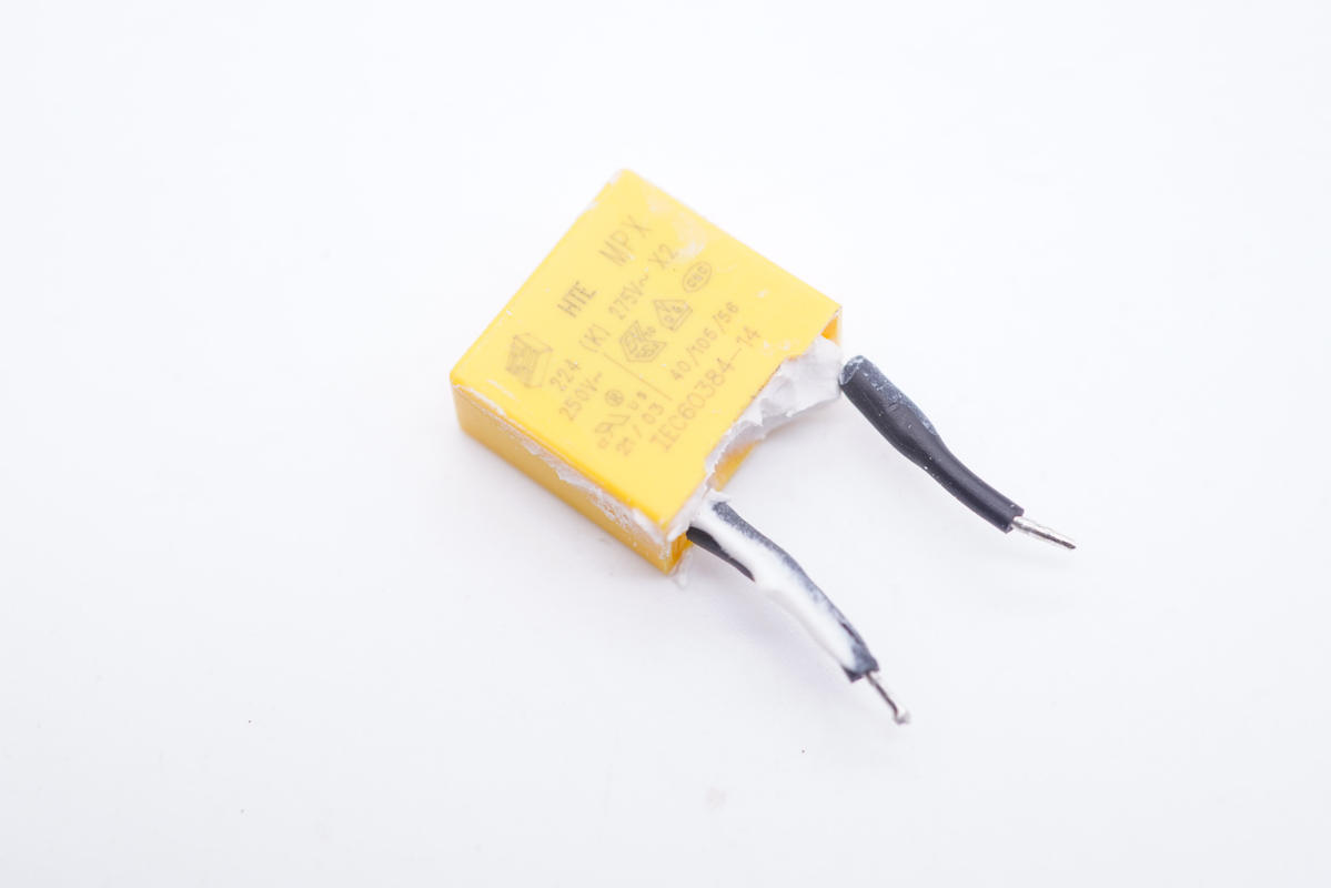 安規X電容特寫,焊腳套有絕緣管。