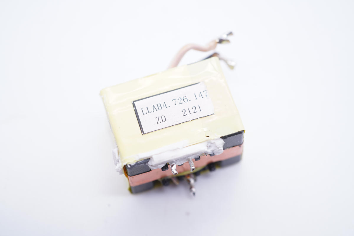 變壓器特寫,纏繞銅箔屏蔽。