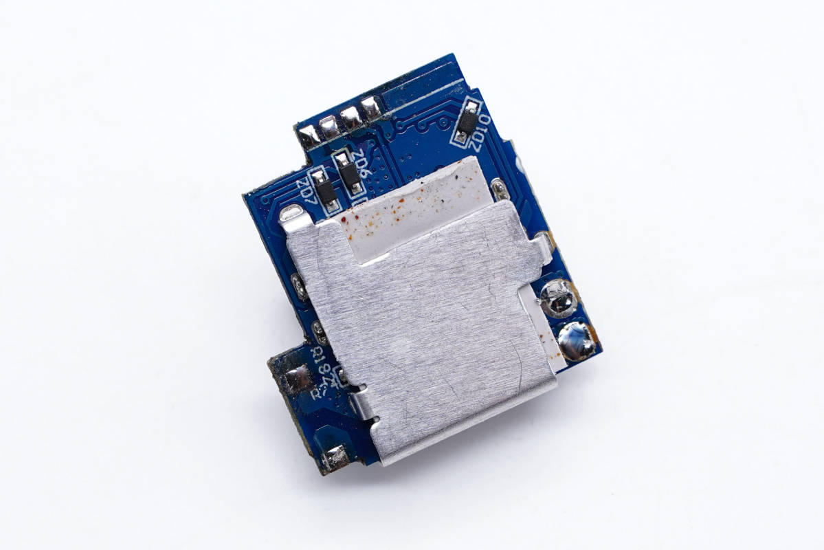 拆掉螺絲取出PCB板,插腳為單獨模組設計,金屬片接觸通電,電池采用黑色塑料殼絕緣保護。