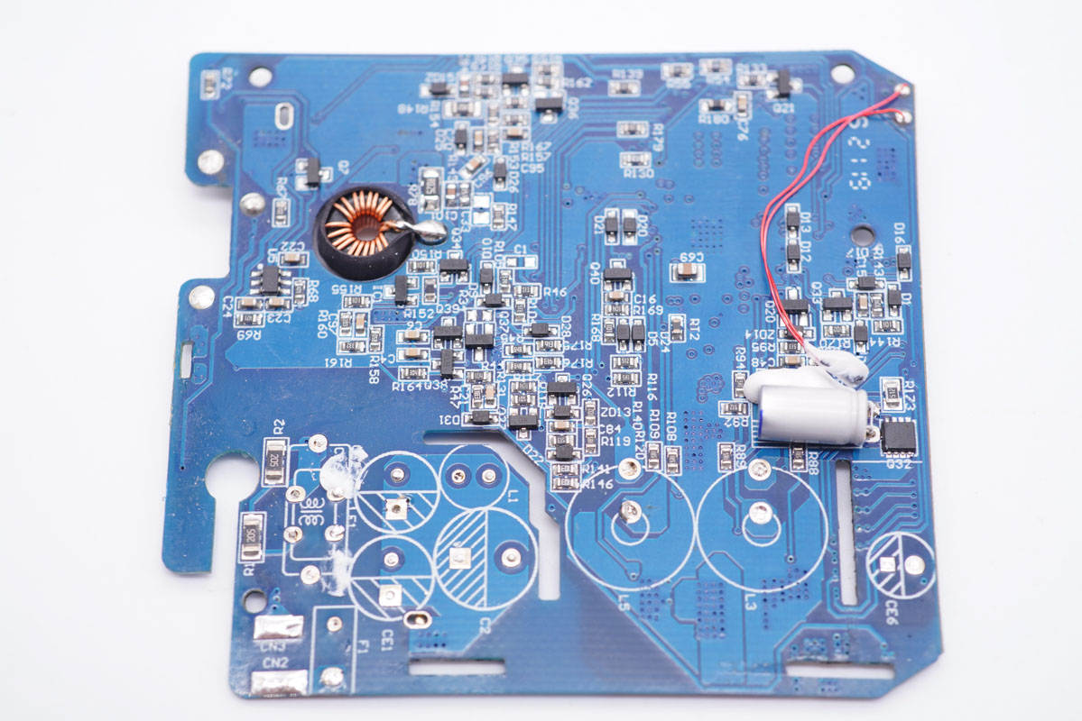主板上設有保險絲、X電容、濾波電容等,輸出端有兩顆升降壓電感以及兩顆濾波固態電容。