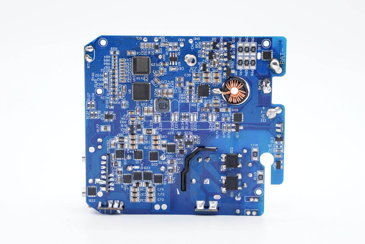 主板背面,左側是兩顆主控芯片以及兩組8顆MOS管組成的升降壓電路。