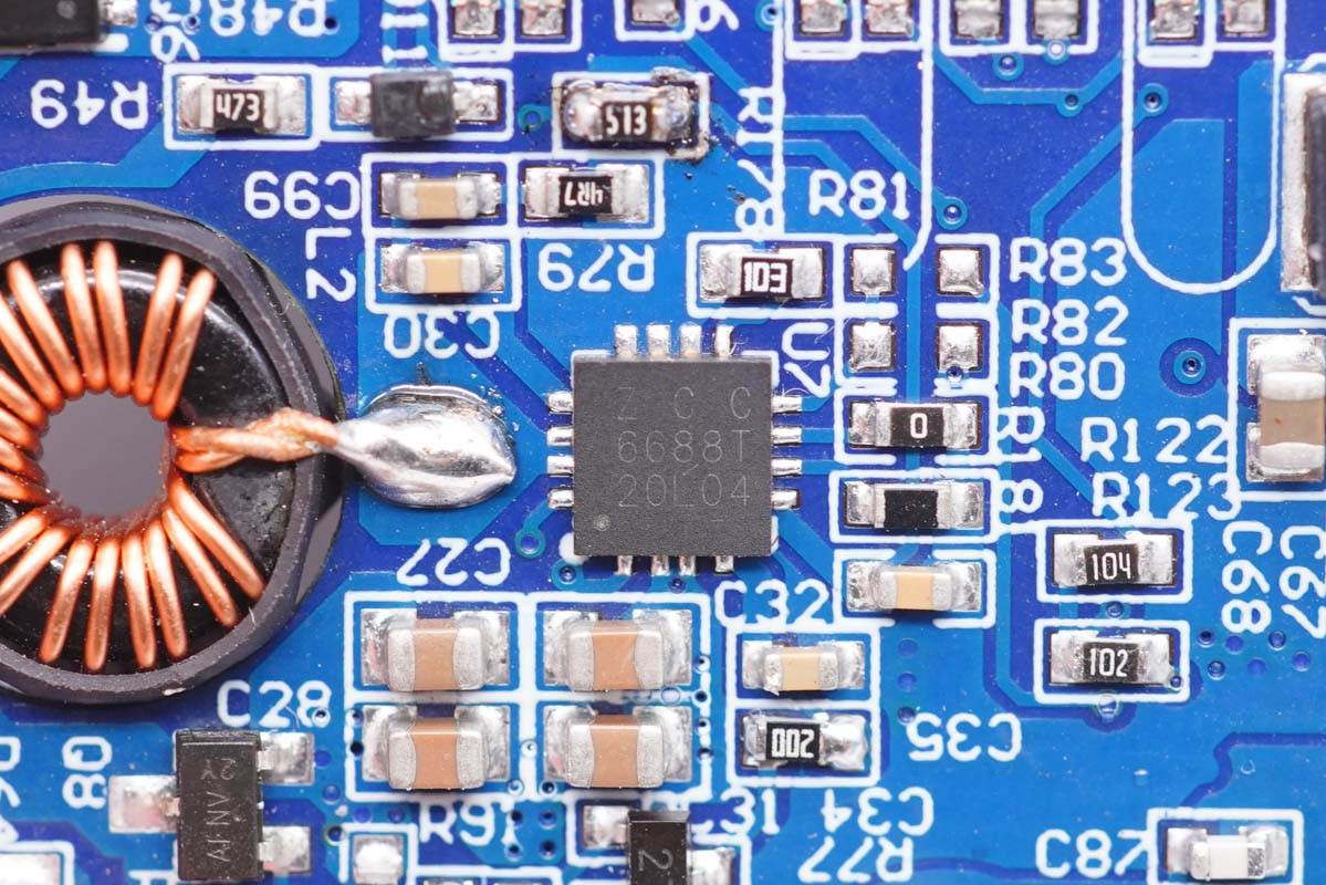拆掉散熱片可以看到有同步整流控制器和整流管。