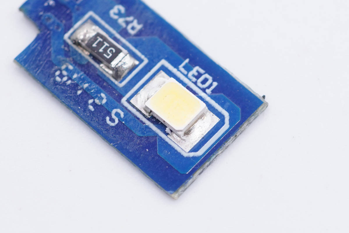 前端焊接一塊LED小板,左側一顆電感沉板設計。