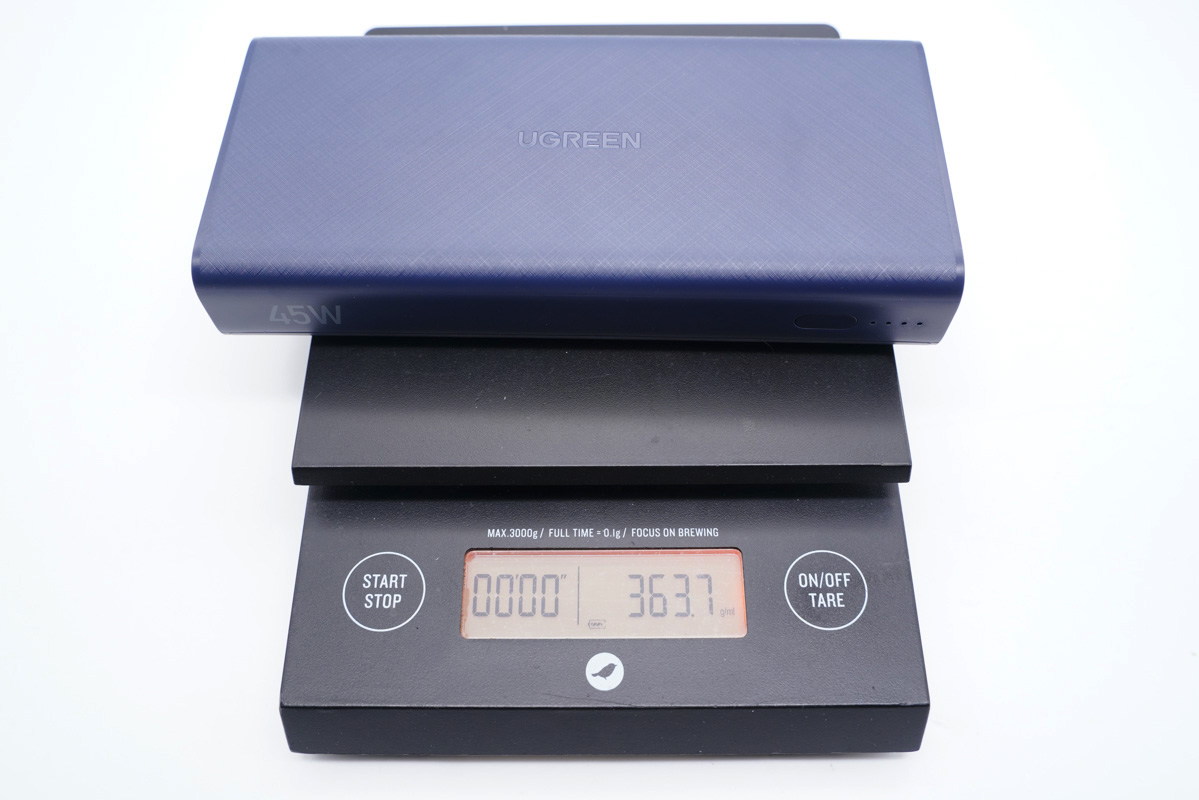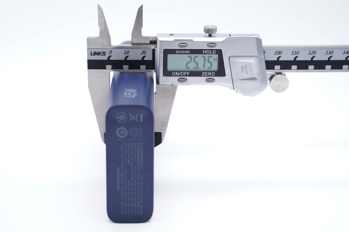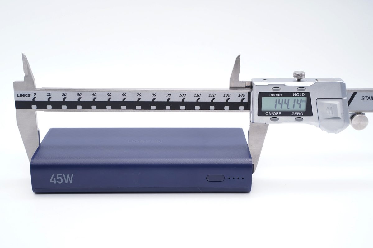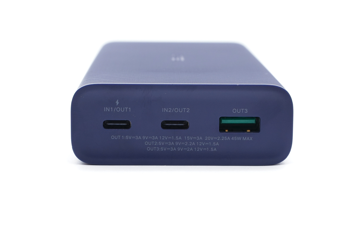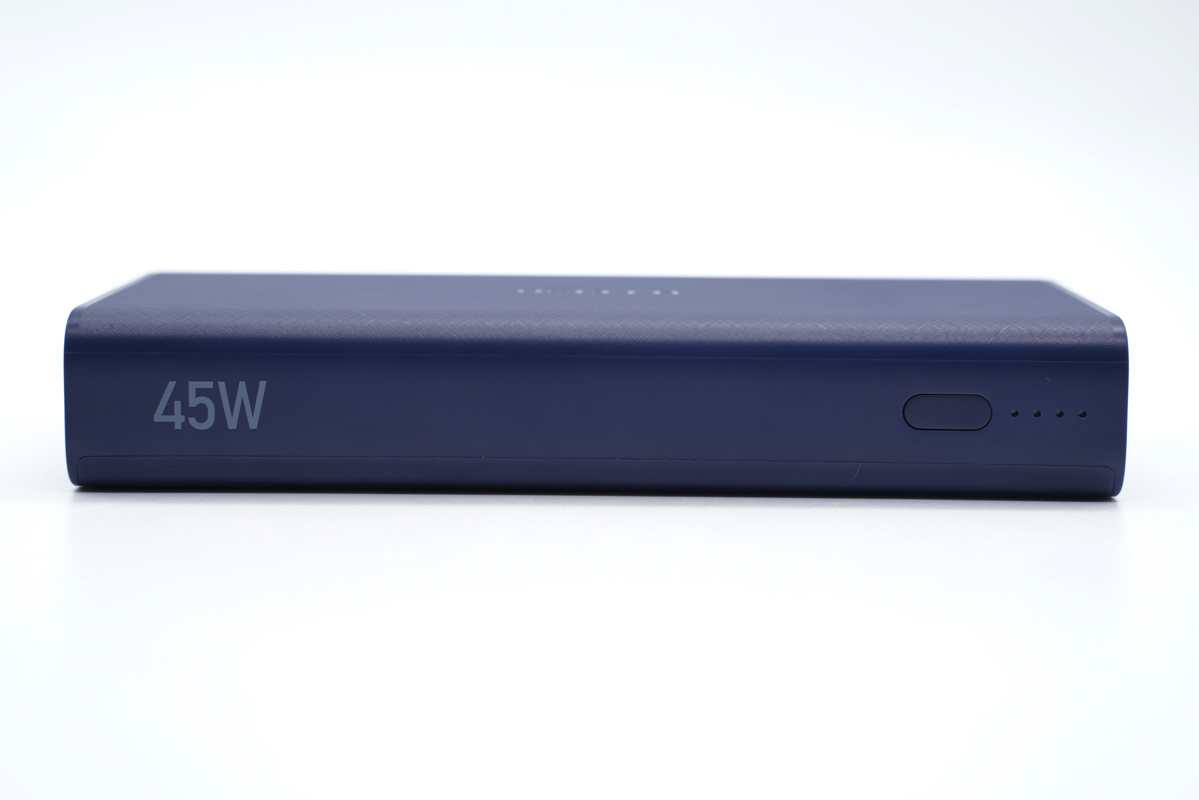 電源按鍵和電量指示燈位于側面,其中一顆指示燈在充電寶進入快充狀態時顏色會有不同,方便用戶判斷充電寶的工作狀態。左側的45W標識說明了充電寶支持45W大功率充電。