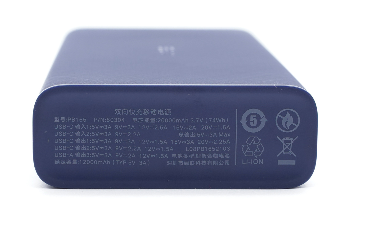 UGREEN綠聯的這款充電寶內置20000mAh的電池容量,配備2C1A共3個充電接口,2個C口均支持雙向快充,這在目前的充電寶市場還不多見。