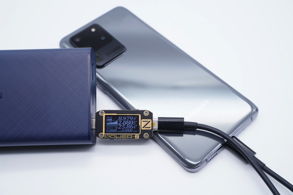 USB-C2支持20W自充電,也是處于快充輸入狀態,不過推薦使用C1接口為充電寶充電,可以更快的恢復充電寶的電量。