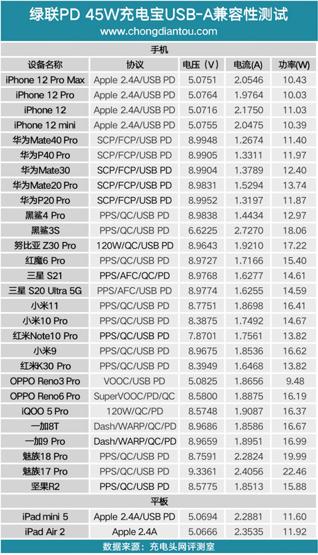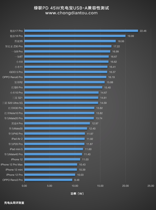 柱狀圖這里魅族17 Pro的功率最高,已經超出了USB-A接口的標稱功率值,可見USB-A接口的輸出功率在設計上是預留出了一定的功率余量的。