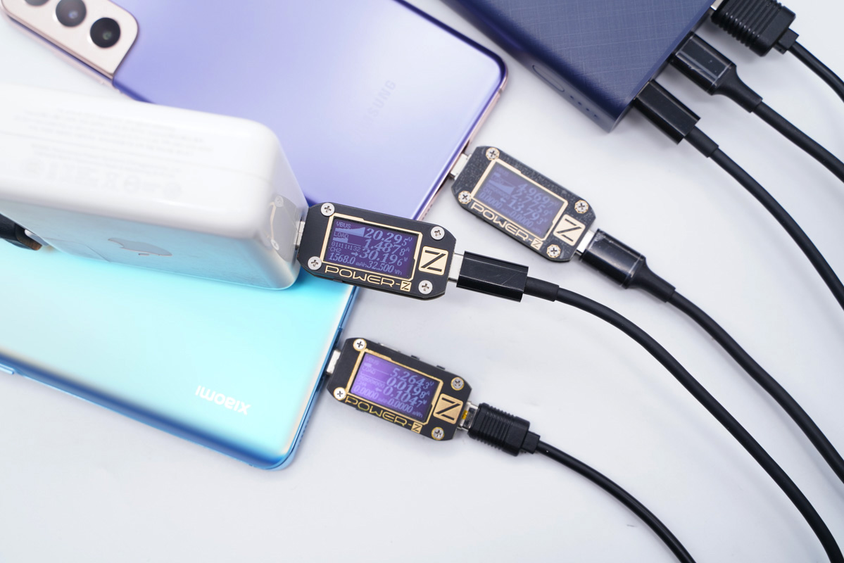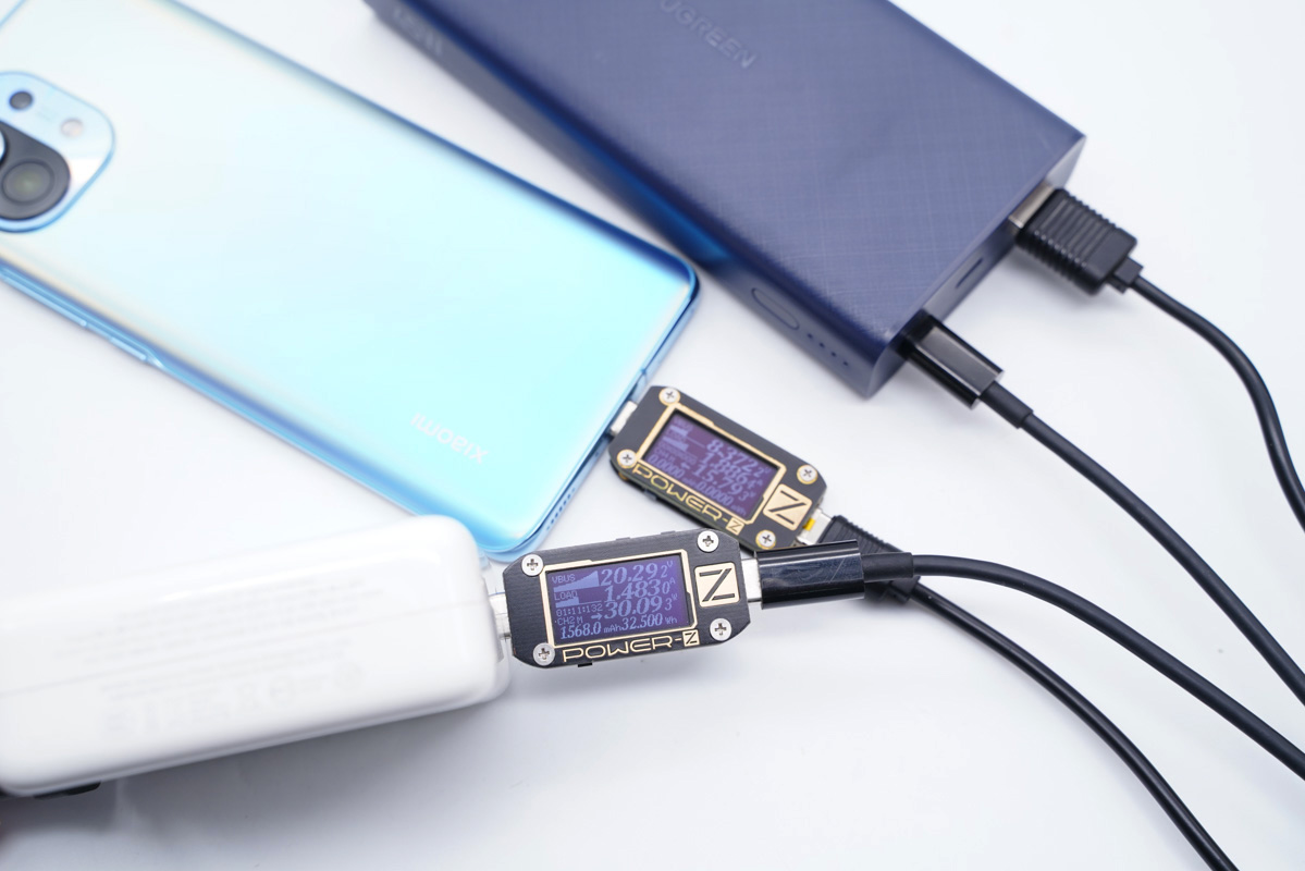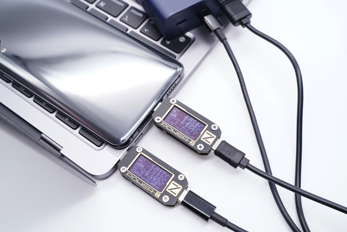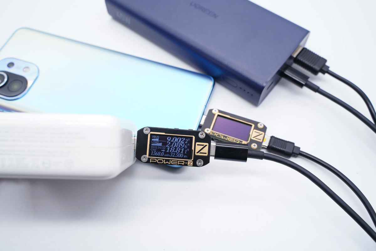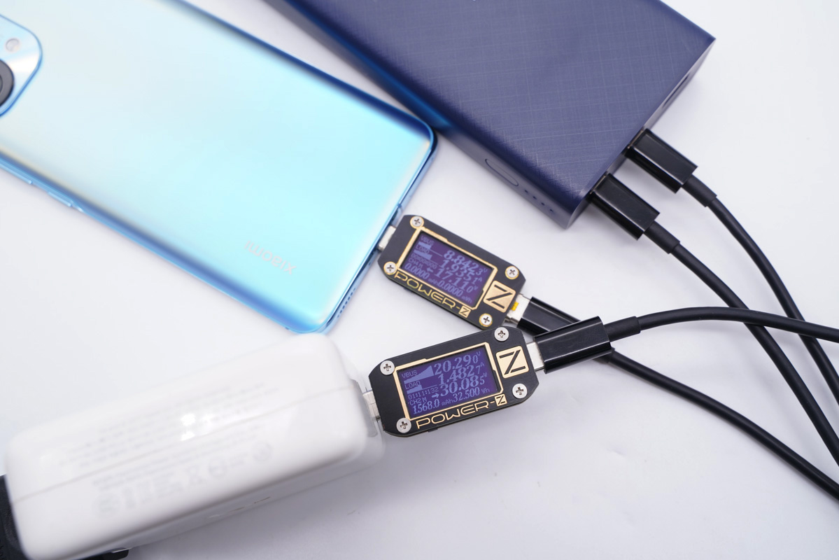 通過C1為充電寶充電,同時使用C2為手機充電,實測可以正常充電使用且均處于快充狀態。