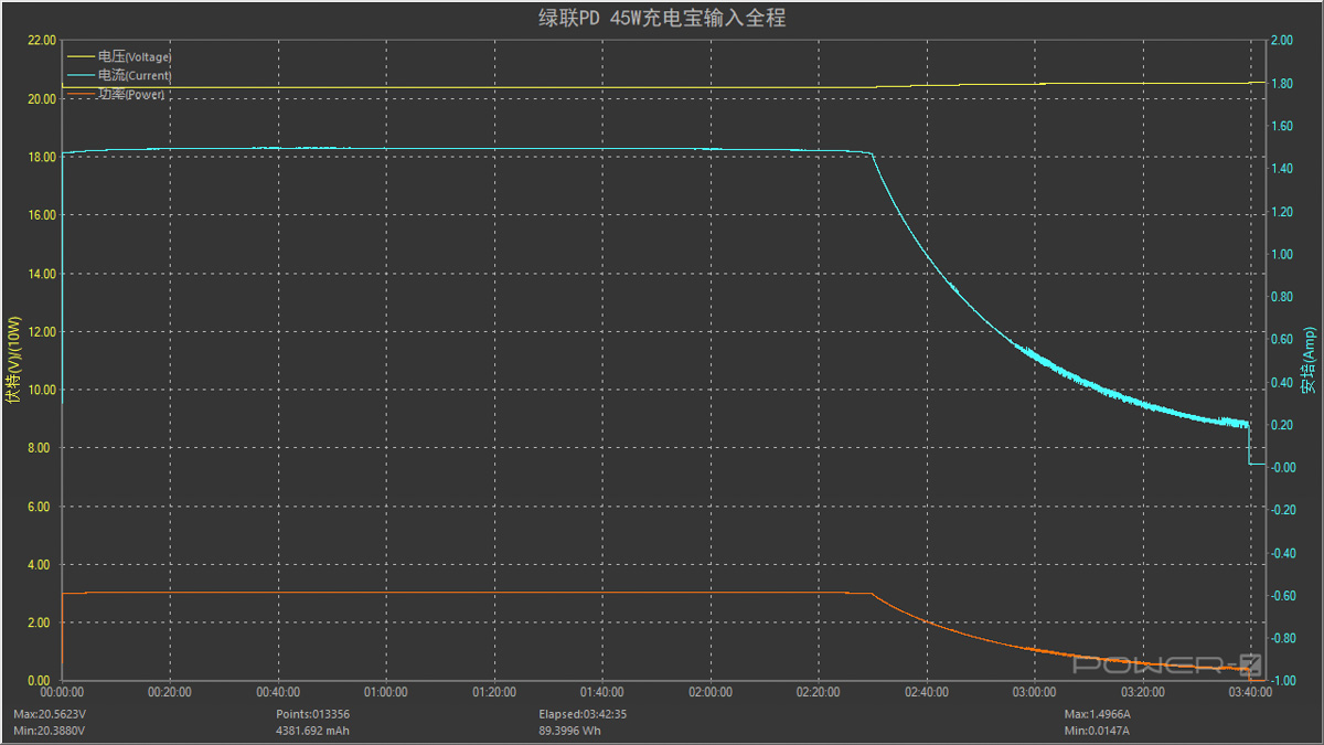 這是使用PD充電器為充電寶充電的全程變化,連接充電器之后握手20V高壓快充檔,2小時29分前功率處于30W階段,隨后功率和電流逐漸下降直至充電結束,全程耗時約3小時39分,最高功率為20.39V 1.49A 30.48W。