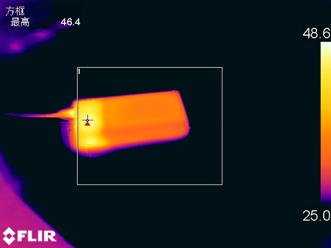 讓充電寶以20V1.5A 30W的功率持續滿載輸出半小時后采集到充電寶表面的最高溫度為46.4℃。