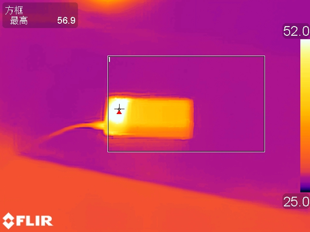 翻轉至另一側,充電寶表面的最高溫度為56.9℃。