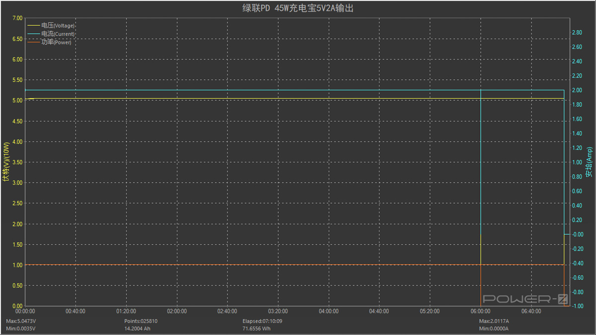 首先讓充電寶以5V2A檔位輸出,整個測試過程很穩定,全程耗時約7小時06分。放出的能量約為71.6556Wh,所以充電寶在以5V2A檔位輸出時的效率約為71.6556/74=96.83%。