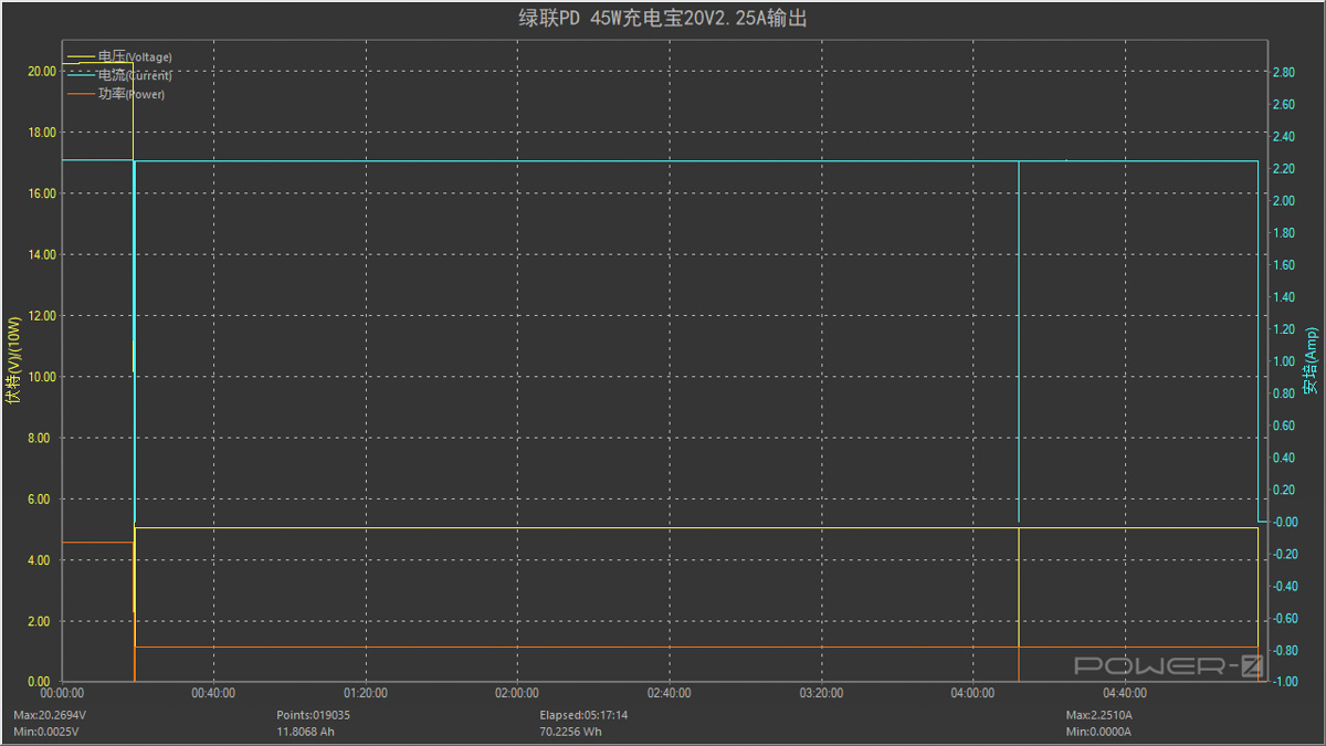 最后以20V2.25A 45W的功率持續輸出,在約20分鐘的時候降至5V2.25A輸出,持續到5小時15分鐘時輸出停止。