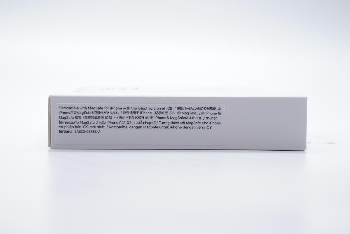 側面貼紙上標有兼容設備信息,適用于iPhone(配最新版iOS)的MagSafe。