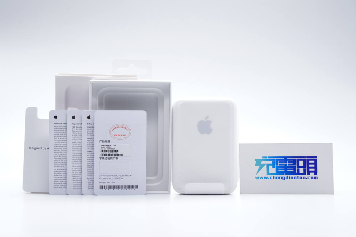 包裝內全部東西一覽,包括MagSafe 行動電源、多份使用說明書以及保修憑證。