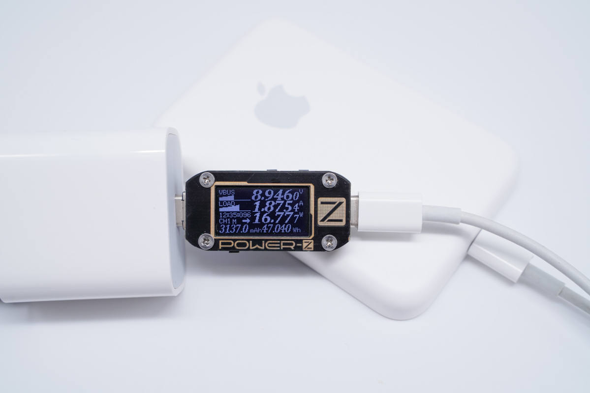 使用蘋果原裝20W充電器給MagSafe 行動電源充電,通過ChargerLAB POWER-Z KM001C測得輸入功率為8.95V 1.88A 16.77W,對于這個容量的充電寶來說真是相當快了。