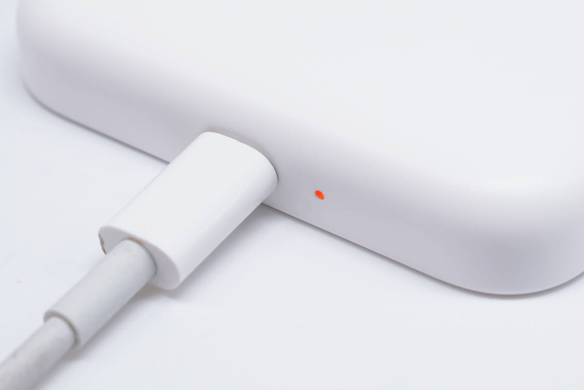 機身底部中心設有Lightning輸入接口,采用金屬環裝飾相當精致,右側有一顆LED充電指示燈。