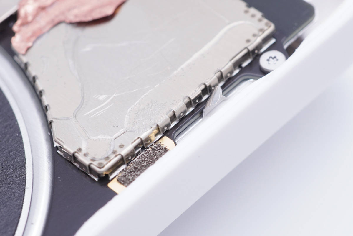 取出電池可以看到下方還有金屬散熱板和銅箔。